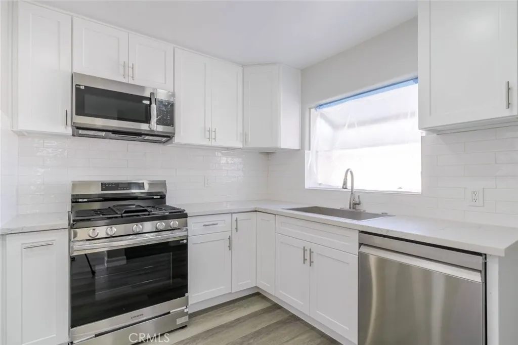 The interior showcases fresh white paint throughout, recessed lighting, ceiling fans, and stylish gray laminate flooring that creates a bright and cohesive feel. The kitchen is thoughtfully upgraded with quartz countertops, stainless steel appliances, and a clean white backsplash, combining functionality with modern design.