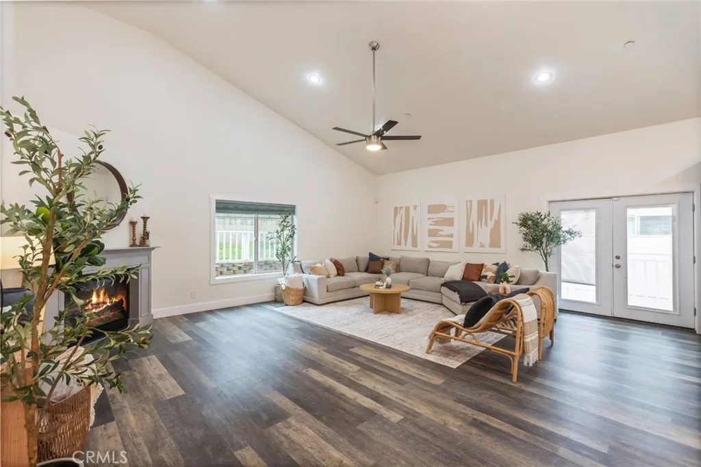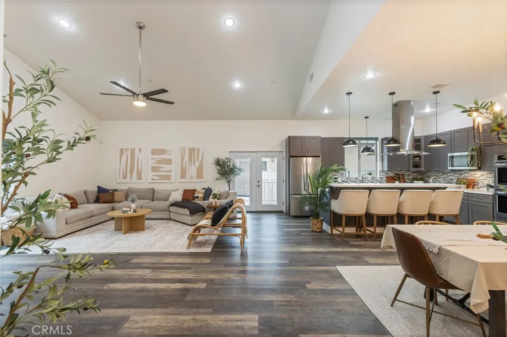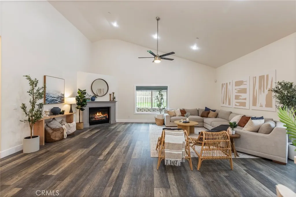 Dramatic 25+ foot ceilings and an expansive open floor plan create a sense of architectural presence, while an abundance of natural bright light flood the interior. Wide-plank designer flooring flows seamlessly throughout, elevating the home’s clean, modern aesthetic.