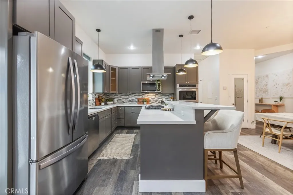 At the center of the home, the chef’s kitchen is both elegant and functional, featuring quartz countertops, custom designer cabinetry, and a substantial island with generous seating – ideal for everyday living and effortless entertaining. The kitchen opens seamlessly to the main living and dining areas, creating a cohesive space designed for connection and flow.