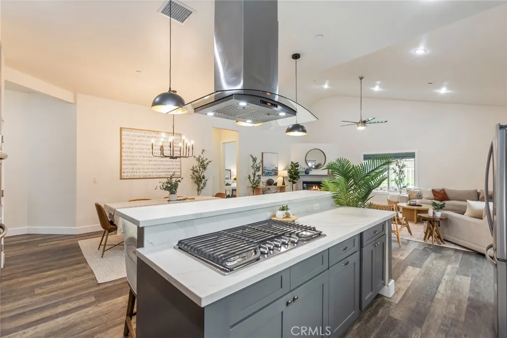 At the center of the home, the chef’s kitchen is both elegant and functional, featuring quartz countertops, custom designer cabinetry, and a substantial island with generous seating – ideal for everyday living and effortless entertaining. The kitchen opens seamlessly to the main living and dining areas, creating a cohesive space designed for connection and flow.