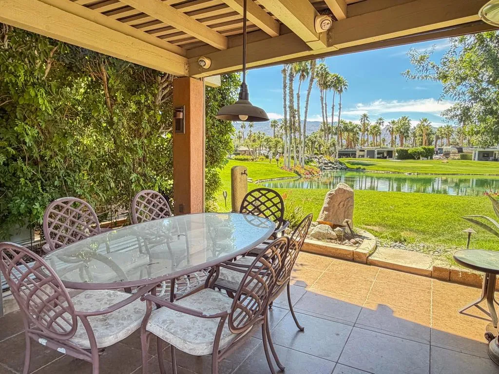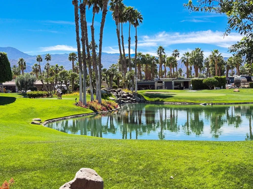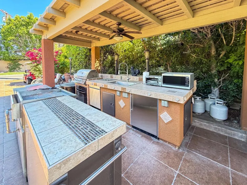 Enjoy relaxed resort living on this well-appointed lot at Outdoor Resort Indio, featuring beautiful evening views of the lake and waterfall directly in front. The lot offers excellent privacy with full-height hedges and mature landscaping and is positioned away from golfer traffic, allowing peaceful enjoyment of the golf course. The quiet location includes parking for two vehicles plus a golf cart.An L-shaped wood pergola with a metal-skinned roof anchors the outdoor living space, complemented by all-tile RV pad and flooring, LED lighting, two ceiling fans, and electric sun shades with remote control. The outdoor kitchen includes a cooktop, BBQ, dishwasher, oven, refrigerator, sink with hot water and garbage disposal, plus a rolling island with commercial burners and flat-top griddle.The lot is furnished with a wicker sofa set and end tables, a round dining table with four cushioned chairs, and a round fire table with cushioned seating and ottomans. A TV is located in the living area under the pergola, and a mushroom heater adds comfort in cooler evenings. A washer and dryer and rolling stainless steel tool cart add convenience, and the golf cart is negotiable. Washer and dryer utility hookups are in ($2,000 value) ready for upgrade with HOA approvalThis private, quiet lot offers exceptional water views and inviting outdoor living at one of the desert’s premier Class A motorcoach resorts.ORI is a class A motorcoach community.