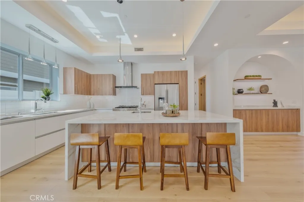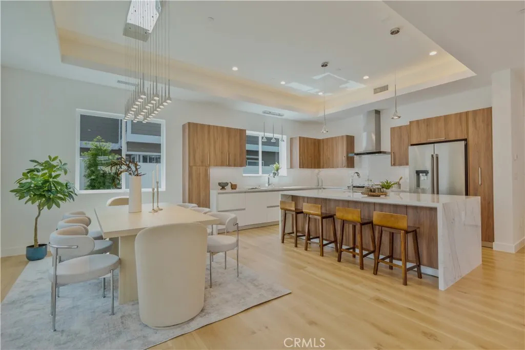 Step into modern luxury with this beautifully crafted 4-bed, 3.5-bath detached townhome, where thoughtful design and high-end finishes come together to create the perfect living space. Artfully designed by Alex Ioda, whose signature modern minimalism defines the home’s unique presence, and built by Ioda Construction Inc., this residence blends clean lines, warm textures, and purposeful functionality throughout. Wide-plank oak engineered hardwood flooring complements the custom-built cabinetry, durable porcelain kitchen countertops, and a striking waterfall island that serves as the home’s central gathering point. High-end appliances, including a JennAir range, refrigerator, microwave drawer, and Bosch dishwasher, ensure a top-tier culinary experience, while under-cabinet lighting and a stylish dry bar add extra flair.