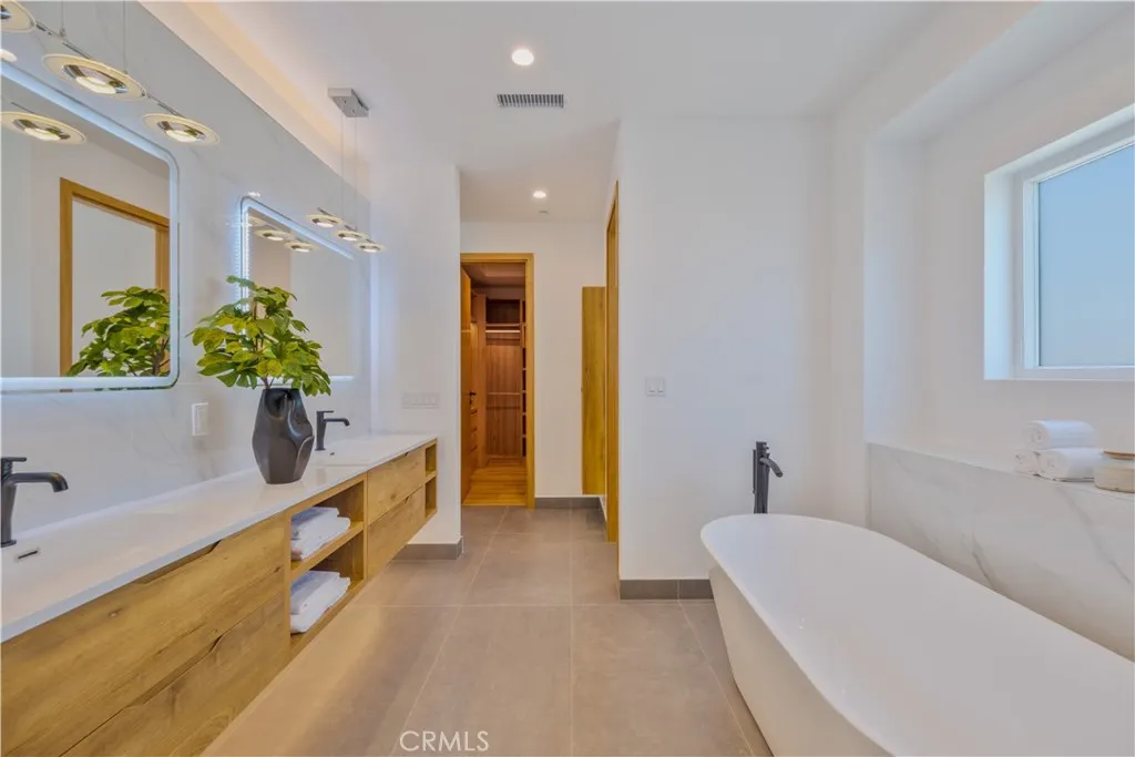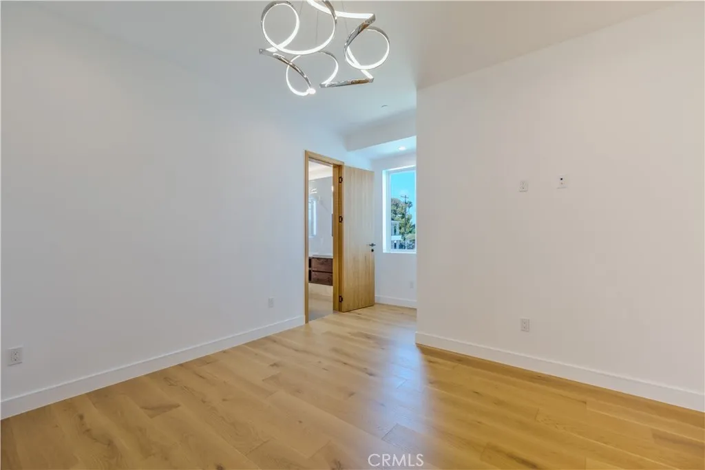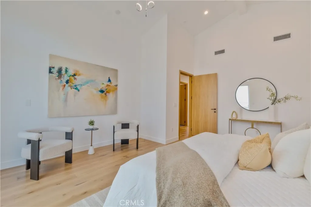 The master suite is a true retreat, featuring a private balcony, a stunning walk-in closet, spa-like bathroom with double-glazed porcelain tiles, a standalone soaking tub, and a two-person shower. Custom built-in closets provide ample storage and imported solid Nordic Oak interior doors from Spain, complete with magnetic latches, add a sophisticated touch.