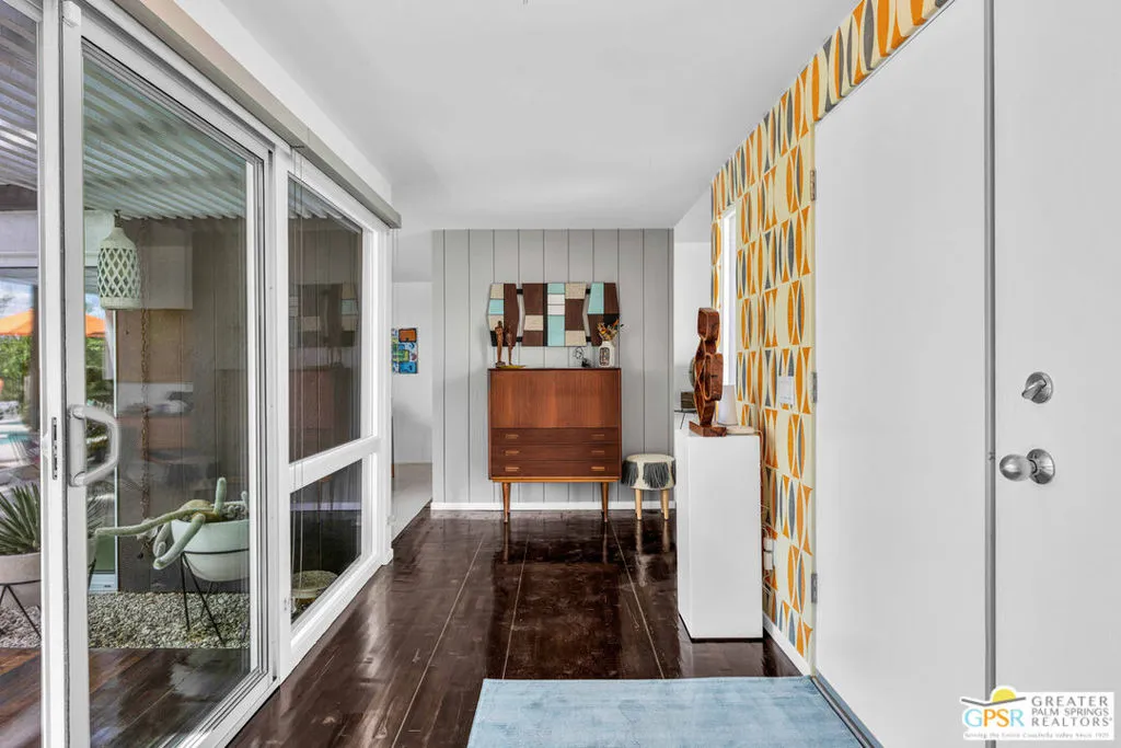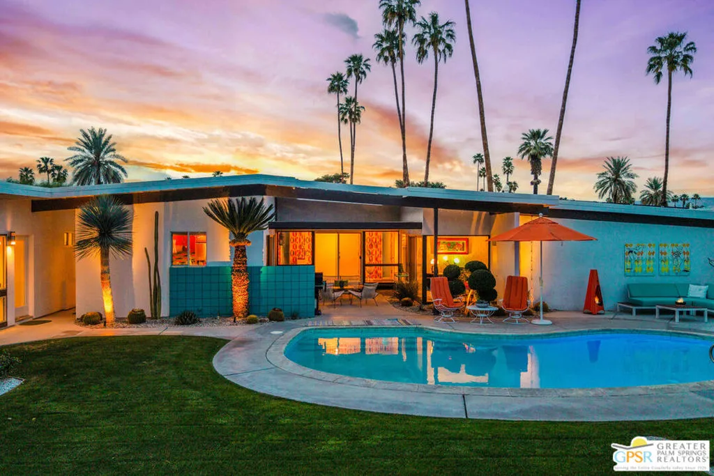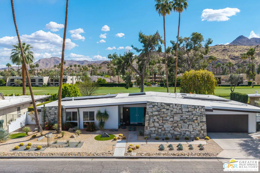Stunning mid-century home in Tahquitz Creek Golf community, a hidden gem in Palm Springs! This home was designed by iconic architect Donald Wexler, built in 1965, and is one of a few left in updated yet original condition. The current owners have updated what needed to be and have lovingly restored key features. Some of the key original features are: kitchen cabinets, cabinet hardware, stove top, oven, the amazing fireplace, bathroom cabinets, the roman shower in the primary bath, the atrium off the primary shower, the covered patio, the block walls, the rock walls and the pool. In addition a detached MCM inspired ADU/casita was added that can be a guest house or income producing. The ADU is 499 sq ft in size, features a living room, bedroom, kitchenette and bath. The main home features a living room, open to the dining room via a stunning stone wall, an oversized primary bedroom with sitting area, and 2 guest bedrooms, one was used as a Den. The outdoor spaces truly typify the Palm Springs lifestyle. Large, open rear yard, pool, spa, multiple lounging areas all looking towards golf course greens and fabulous mountain views. The finishing touches are owned solar, and desert friendly landscaping. A stunning home!