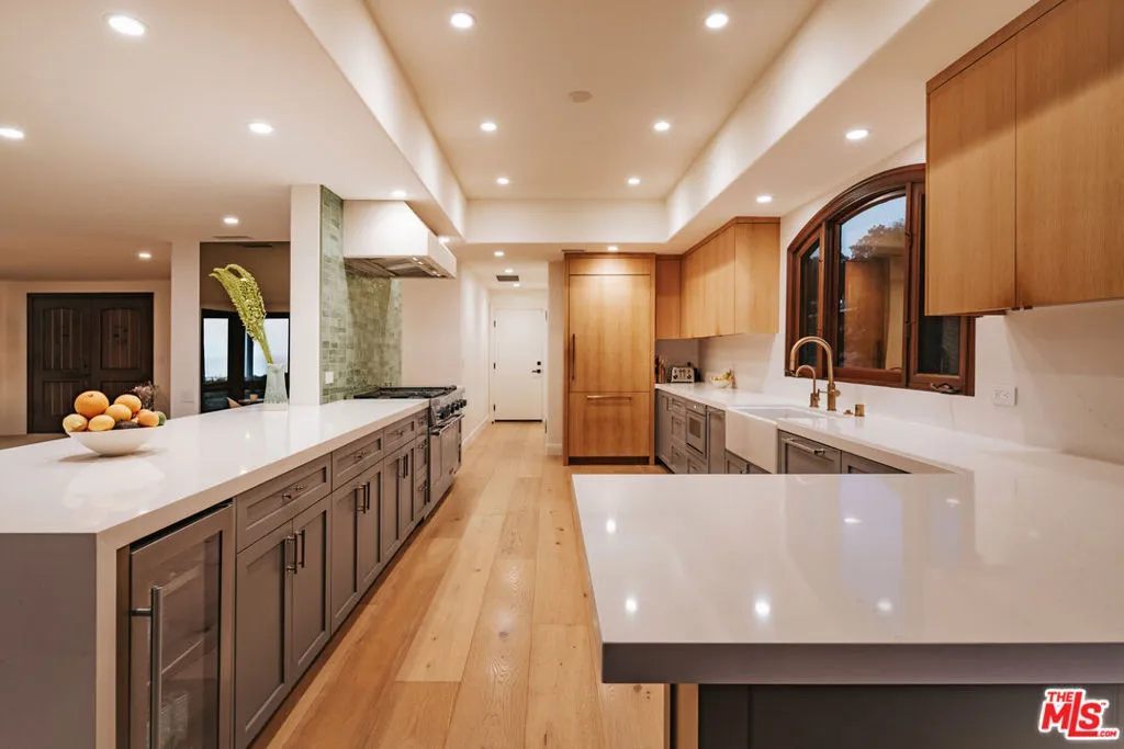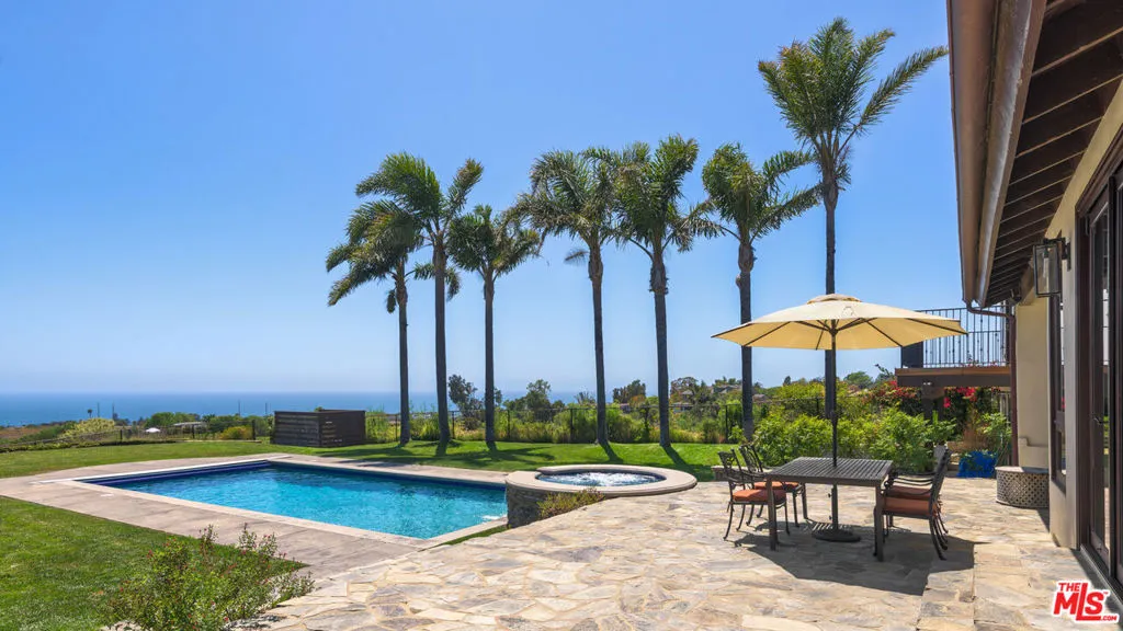 Set atop a private, elevated rolling knoll in prestigious Malibu Park, this reimagined and romantic Modern Mediterranean estate offers elevated coastal living on over two park-like acres of fully usable land with unobstructed ocean views and exceptional privacy. This is a rare opportunity to own a legacy estate that defines luxury coastal living in Malibu. A long, tree-lined driveway leads to a beautifully renovated 4,898 sq ft main residence, showcasing wide-plank white oak floors, custom cabinetry, and a sunlit open-concept layout. The designer kitchen features quartz countertops, brand new appliances and sweeping views of the Pacific. Indoor living spaces flow effortlessly to a covered heated terrace, sparkling saltwater pool, and manicured lawn. The home offers 5 bedrooms and 6 bathrooms across three structures, including a 1,100 sq ft guest house with expansive ocean views, a sun-lit deck off the main bedroom, vaulted ceilings, two brick fireplaces, full chefs kitchen, and a lower level featuring a large bonus room and full bath ideal for extended stays or a private office. A separate 500 sq ft studio offers additional flexible space for a theatre, creative work or wellness. Outdoors, California native landscaping surrounds the property, with sycamore, oak, fruit trees, coastal sage, adding natural beauty and privacy. A vine-draped pergola, tiered fountain, and ocean-facing lounge areas create the ultimate setting for entertaining and relaxation. Additional upgrades include a full-house generator and whole-house water filtration system. Located minutes from Zuma Beach, Malibu schools, and scenic trails, this one-of-a-kind estate is the perfect blend of luxury, nature, and modern California living.