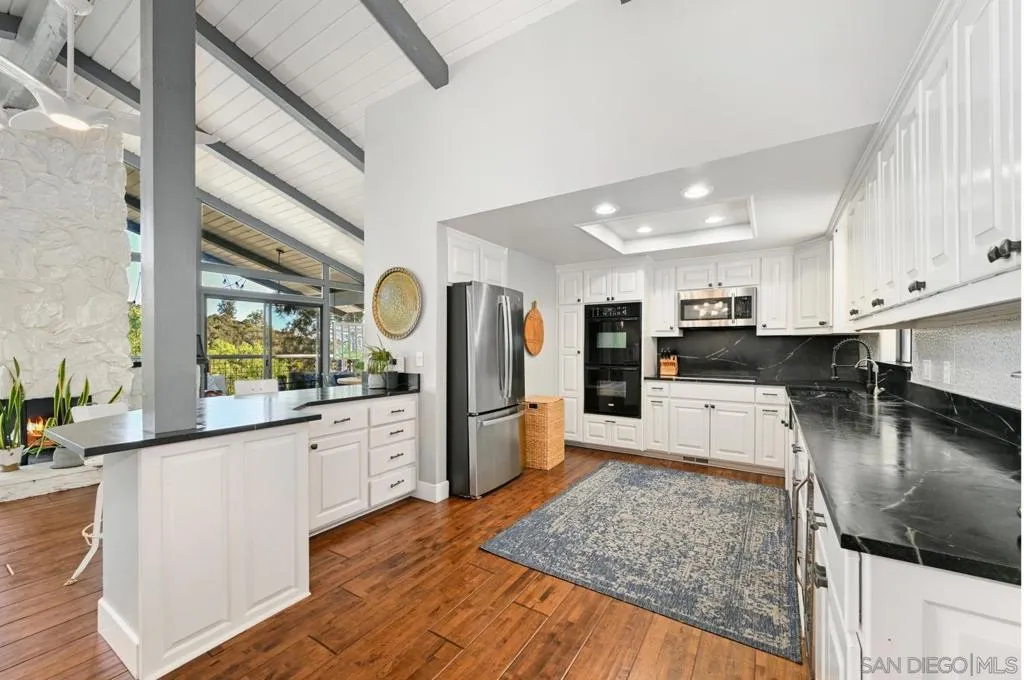 Situated on just over an acre, this remarkable home offers privacy, sweeping views, and elevated modern comfort. Designed for hosting and everyday living alike, the expansive layout features dramatic cathedral ceilings, a sunken living room, and picture windows that capture the surrounding scenery. The heart of the home is a beautifully designed kitchen with crisp white cabinetry, stainless steel appliances, a farmhouse sink, and a modern custom backsplash—perfectly suited for entertaining. Additional highlights include a cozy fireplace, luxury vinyl plank flooring throughout all bedrooms, custom tile showers, and on-trend barn door accents. Outdoor living is truly exceptional, with a wraparound balcony and a resort-style backyard showcasing a pool and spa finished with a mini-pebble surface, expansive grassy areas, and mature trees that enhance the tranquil setting. Energy-efficient solar paired with a Tesla Powerwall, central air conditioning, and a flexible floor plan—including a private downstairs double primary suite option—add comfort and versatility. A large circular driveway offers abundant parking, while the attached three-car garage provides added convenience. Located in a peaceful, quiet neighborhood with easy access to I-15, this two-story retreat delivers the perfect balance of seclusion, luxury, and commuter-friendly living.
