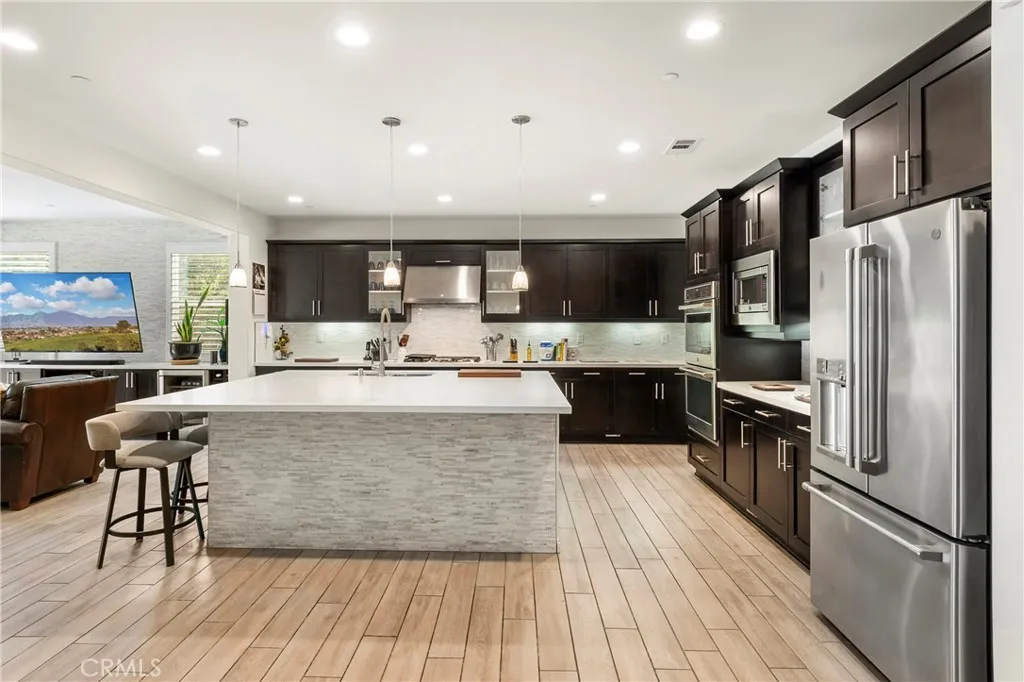 Discover Unrivaled Luxury in Your Private Tropical Oasis: Experience the pinnacle of sophisticated living in this superbly appointed estate. From the moment you pass through the cast-iron gates into the private, travertine-tile atrium, you are greeted by an entertainer’s paradise defined by soaring 20ft ceilings and cascading natural light. The open-concept floor plan flows seamlessly from the living room—featuring a floor-to-ceiling travertine fireplace—to a chef’s kitchen that is a masterclass in design. Outfitted with a massive quartz-top island, quartz counter-tops, marble-tiled backsplash, professional-grade stainless-steel appliances, and dark espresso wood and glass cabinetry, this kitchen is as functional as it is beautiful. Be sure to check out the massive walk-in pantry!