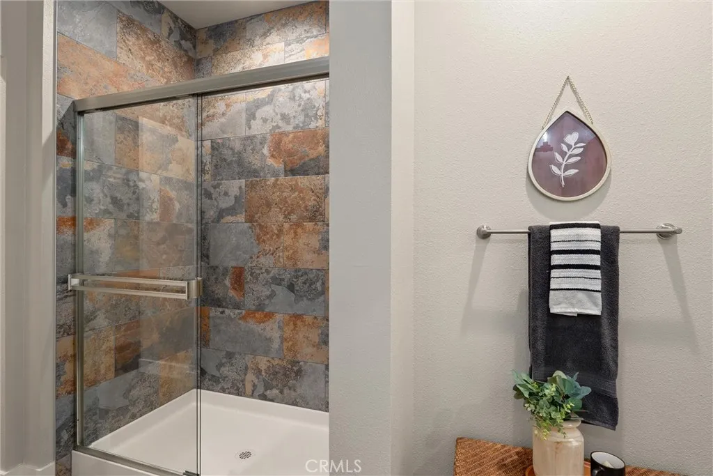 The luxurious primary suite is a private retreat, showcasing a spa-like en-suite bathroom with an oversized walk-in shower, dual sink vanity, and a generous walk-in closet—perfect for comfort and convenience.