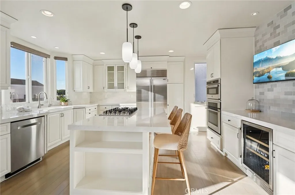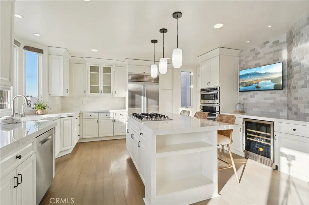 The recently remodeled kitchen is bright, functional, and inviting, featuring a large center island with seating, high-end stainless steel appliances, a wine refrigerator, and generous workspace for daily use. A guest bath, coat closet, and additional storage complete this level.