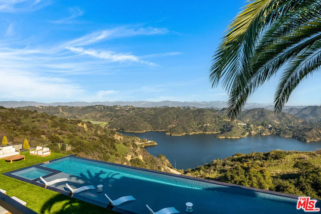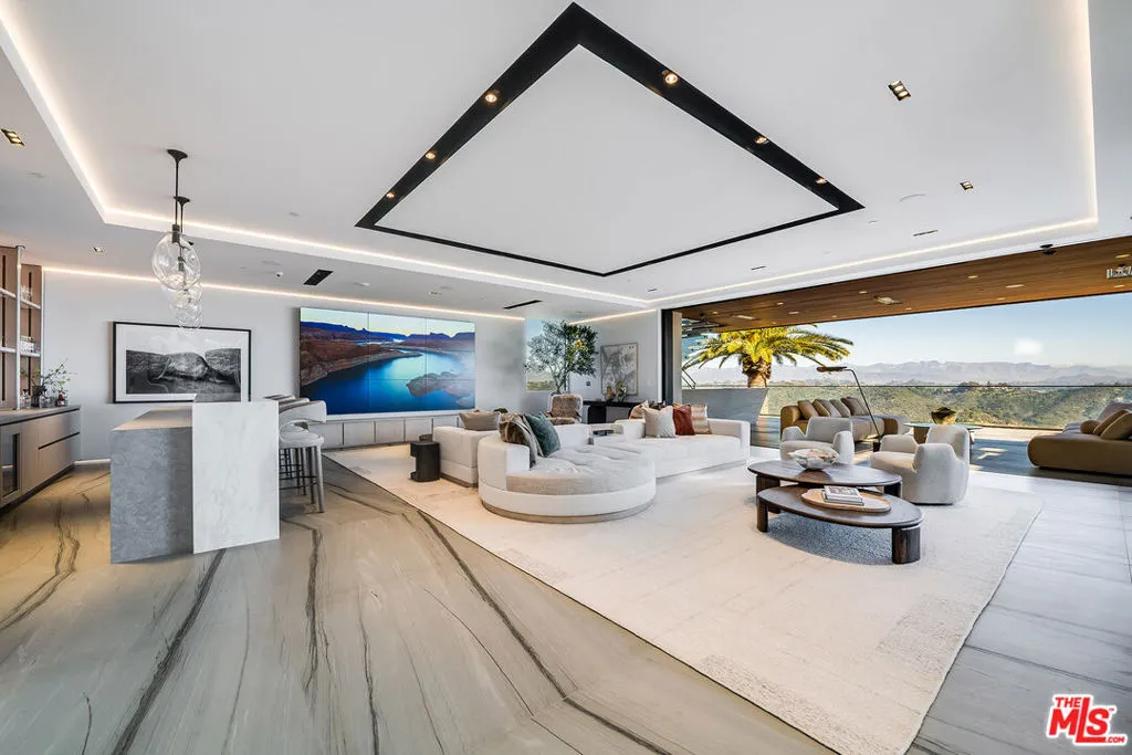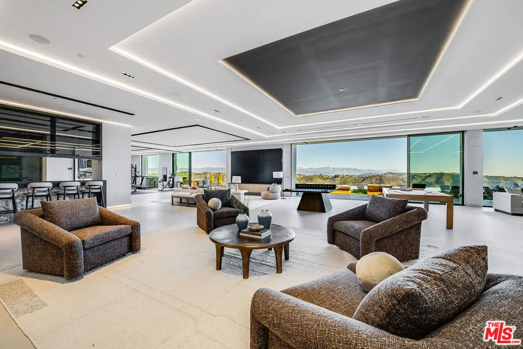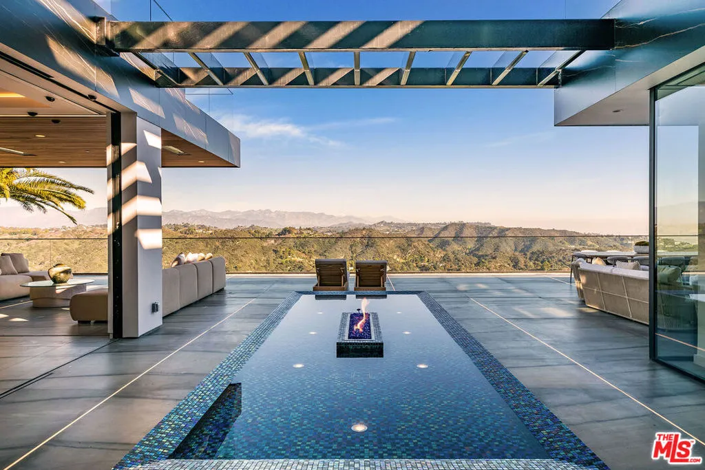 VANTAGE rises above Bel Air as a cinematic architectural estate defined by sculptural design, luminous presence, and sweeping panoramic water, canyon, and city views with a seamless connection to its natural surroundings. Approached through a dramatic double gated entry and expansive motor court, the residence reveals custom architectural illumination, tranquil reflecting water features, mature olive trees, and striking backlit onyx columns that create a powerful sense of arrival.Designed to maximize light, views, and flow between living and lounge spaces, the main living pavilion unfolds as a glass wrapped volume suspended above the landscape. Full height automated glass doors with integrated curtain systems dissolve the boundary between interior and exterior, while private balconies extend from every room to create a continuous indoor outdoor living experience. Refined stone surfaces, warm wood tones, and curated materials balance modern precision with organic warmth. A floating green onyx staircase acts as a sculptural spine connecting all levels, enhanced by 28 foot operable skylights that flood the home with natural light and fresh air.The residence features three kitchens, each designed for professional grade performance and seamless service. The main level kitchen showcases dual oversized fully adjustable islands, Gaggenau appliances, European cabinetry, and a walk-in industrial stainless steel refrigeration room. A separate chef’s kitchen with Miele appliances supports large scale preparation, complemented by a discreet service kitchen and outdoor culinary area with pizza oven for catered entertaining.A designated Entertainment Level offers a private two lane bowling alley with its own full bar, cinema grade theater, sophisticated lounge areas, additional bar spaces, temperature controlled wine cellar, and a dedicated Glamour Room designed for private preparation. Throughout the residence, 28 flat screen televisions are professionally installed in nearly every space.A full wellness retreat includes a Turkish hammam with dry sauna and steam room, cold plunge, hot tub, massage area, juice bar, and a glass enclosed fitness studio oriented toward panoramic views.The upper level hosts the primary suite as a private sky level retreat with dual walk-in closets and dual marble and onyx bathrooms appointed with TOTO smart systems. Three additional ensuite bedrooms feature floor to ceiling glass, custom closets, and serene natural finishes.Outdoor living is equally cinematic with an infinity edge pool blending into the horizon, expansive stone terraces, fire features, softly illuminated landscaping, multiple outdoor bars for resort style entertaining, and a private hillside vineyard with approximately 600 trees.Additional features include elevator access to all levels, full smart home and AV integration, thoughtfully designed service circulation, and a high powered 48 kilowatt backup generator.