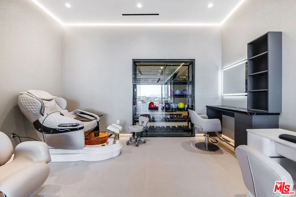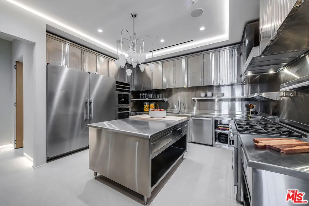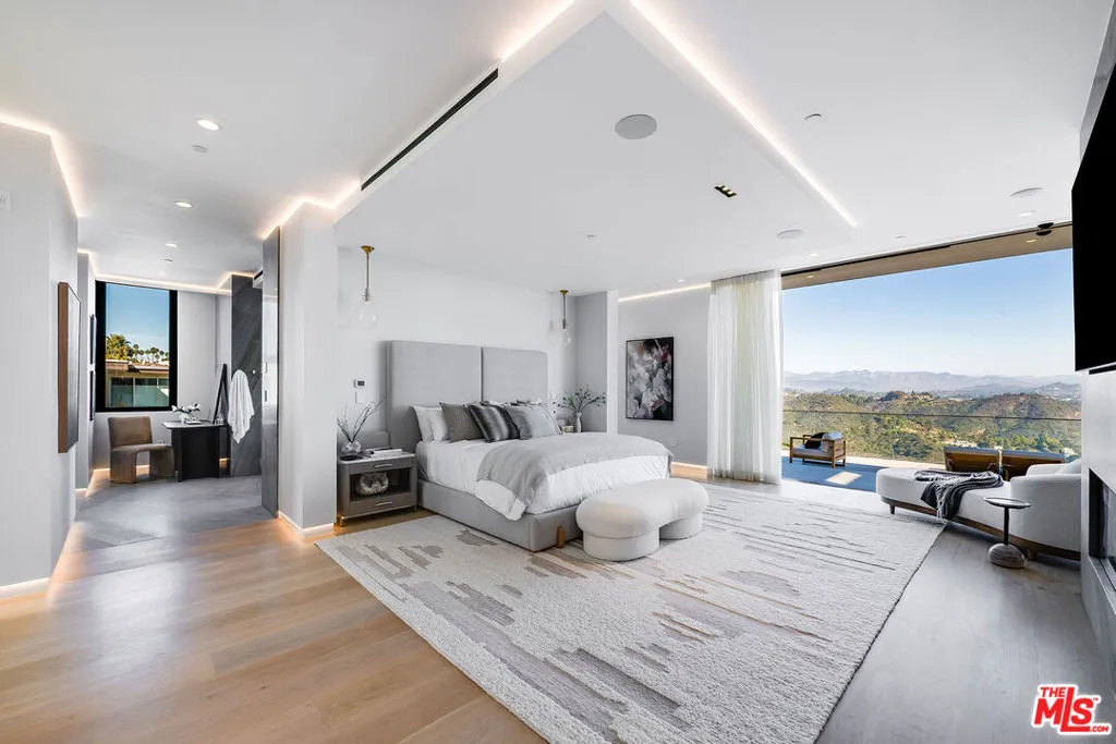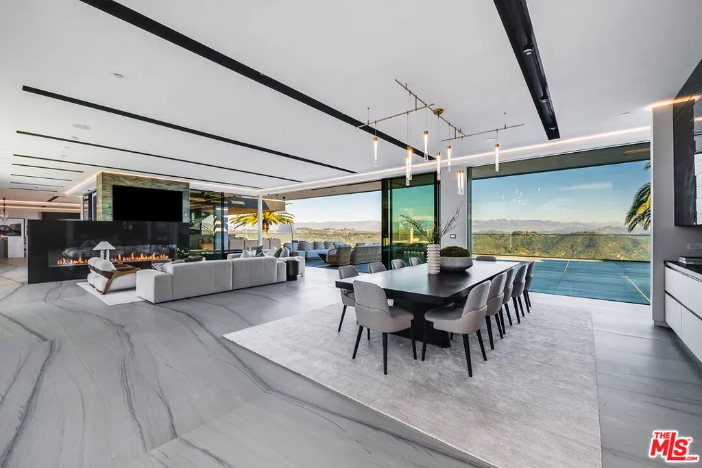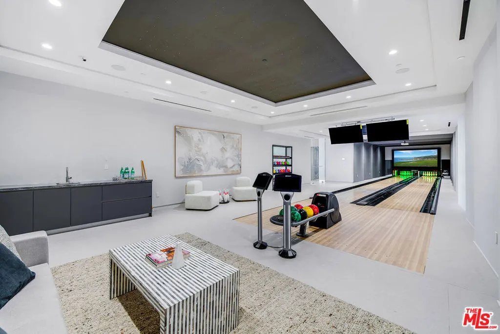 VANTAGE rises above Bel Air as a cinematic architectural estate defined by sculptural design, luminous presence, and sweeping panoramic water, canyon, and city views with a seamless connection to its natural surroundings. Approached through a dramatic double gated entry and expansive motor court, the residence reveals custom architectural illumination, tranquil reflecting water features, mature olive trees, and striking backlit onyx columns that create a powerful sense of arrival.Designed to maximize light, views, and flow between living and lounge spaces, the main living pavilion unfolds as a glass wrapped volume suspended above the landscape. Full height automated glass doors with integrated curtain systems dissolve the boundary between interior and exterior, while private balconies extend from every room to create a continuous indoor outdoor living experience. Refined stone surfaces, warm wood tones, and curated materials balance modern precision with organic warmth. A floating green onyx staircase acts as a sculptural spine connecting all levels, enhanced by 28 foot operable skylights that flood the home with natural light and fresh air.The residence features three kitchens, each designed for professional grade performance and seamless service. The main level kitchen showcases dual oversized fully adjustable islands, Gaggenau appliances, European cabinetry, and a walk-in industrial stainless steel refrigeration room. A separate chef’s kitchen with Miele appliances supports large scale preparation, complemented by a discreet service kitchen and outdoor culinary area with pizza oven for catered entertaining.A designated Entertainment Level offers a private two lane bowling alley with its own full bar, cinema grade theater, sophisticated lounge areas, additional bar spaces, temperature controlled wine cellar, and a dedicated Glamour Room designed for private preparation. Throughout the residence, 28 flat screen televisions are professionally installed in nearly every space.A full wellness retreat includes a Turkish hammam with dry sauna and steam room, cold plunge, hot tub, massage area, juice bar, and a glass enclosed fitness studio oriented toward panoramic views.The upper level hosts the primary suite as a private sky level retreat with dual walk-in closets and dual marble and onyx bathrooms appointed with TOTO smart systems. Three additional ensuite bedrooms feature floor to ceiling glass, custom closets, and serene natural finishes.Outdoor living is equally cinematic with an infinity edge pool blending into the horizon, expansive stone terraces, fire features, softly illuminated landscaping, multiple outdoor bars for resort style entertaining, and a private hillside vineyard with approximately 600 trees.Additional features include elevator access to all levels, full smart home and AV integration, thoughtfully designed service circulation, and a high powered 48 kilowatt backup generator.