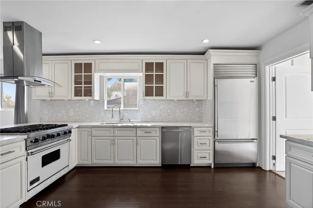 Large windows and thoughtfully placed mirrors maximize natural light and showcase the sparkling blue-water views. The chef’s kitchen is equipped with a Sub-Zero refrigerator, Viking range/oven, premium finishes, and abundant cabinetry — ideal for cooking and gathering with friends and family.