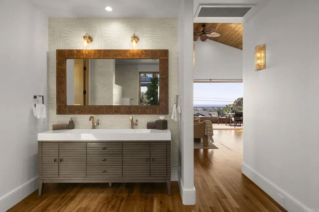 Nestled atop a hill overlooking Olde Carlsbad in the coveted neighborhood of Seacrest Estates, this custom-built masterpiece offers breathtaking PANORAMIC OCEAN views and resides in a tranquil no-through-traffic neighborhood. With 4 bedrooms and 3 baths plus an outdoor shower, the home features unique elegant design throughout. Walking through the door is like walking into a vacation, except, it is home. —-For peace of mind and lower-cost insurance, the home has been rated at the lowest possible risk of fire and flood. See attachment. —-The two-story exterior features ground level and stunning second floor covered porches, New England-style wood siding and trim, a standing seam copper-colored metal roof, artistic exterior lighting, and a broad custom-finished driveway big enough to accommodate several guests. The expansive backyard, with fruiting trees (avocado, orange, lemon, banana, and peach), a top-of-the-line Hot Springs spa, beautiful stone patios, and two Sonos outdoor speaker systems creates a secluded backyard entertainment zone. Situated on a 12,000 square foot lot, well over a quarter acre, there’s ample space for gardening, a playground, or potential additions like a pool or ADU. A fully owned SOLAR PV system delivers significant energy offset to power the home. The attached 2.5 car garage has epoxy flooring and a translucent frosted glass garage door catering to needs for parking and workshops. —-Enter the home though the inviting ground level porch and you will find a first floor showcasing 3 bedrooms and 2 baths, one is a suite with bath ensuite. The living area has an antique beamed cathedral-ceiling with an open-plan kitchen/great room adorned with reclaimed hardwood flooring made from 19th century Indonesian railroad ties, and wood triple-pane Pella windows and sliding door with built-in mini-blinds. Two large La Cantina glass folding doors open to seamlessly merge indoor and outdoor living spaces making entertaining a dream. The spacious crafts room features elongated workspaces with wood and stone counters, ample storage, utility sink and a generous laundry area. An adjacent storage room includes built-in shelving and a cedar closet. A wide, brightly illuminated stairway leads to the second floor. —-The second story provides a generous master bedroom, bathroom, and dressing room suite. A 20-foot long La Cantina door opens the master room onto a covered 380 sq. ft. porch with glass wall and railings that bring stunning sunsets and a 180-degree ocean view to your bedside. Interior highlights continue with tongue-in-groove plank cathedral ceilings, solid oak flooring, and 8-inch baseboards. Luxurious amenities abound, such as an oversized walk-in rain shower with accessories and a 135 sq. ft. wardrobe room complete with custom built-in dressers, shelving, and racking. Additional features include Solatube daylighting, custom lighting fixtures, custom built-ins including a wet bar with beverage center. A stunning floor to ceiling fireplace with beautiful large format tile that warms the room on the occasional chilly night and makes reading and TV time extra cozy. Designed with foresight, the home is pre-wired and framed for a future interior elevator to go from the main level to the second floor. —While secluded and quiet, this home is an easy walking distance to the nearby award-winning middle and high school, and minutes’ drive to beaches and the Carlsbad Village. This one-of-a-kind home epitomizes the Carlsbad coastal lifestyle of relaxation, luxury, and convenience. —Schedule your private showing today to experience all this exceptional property has to offer.
