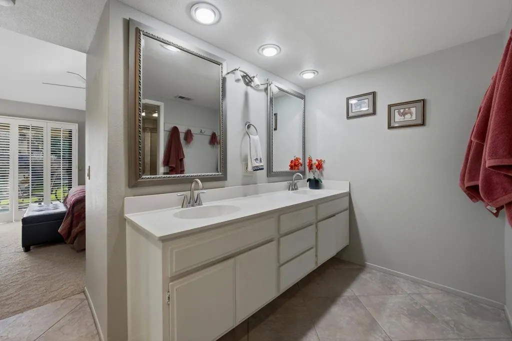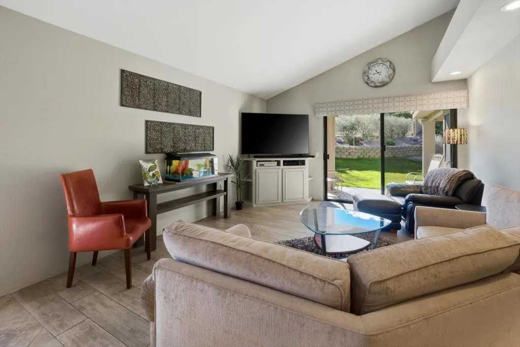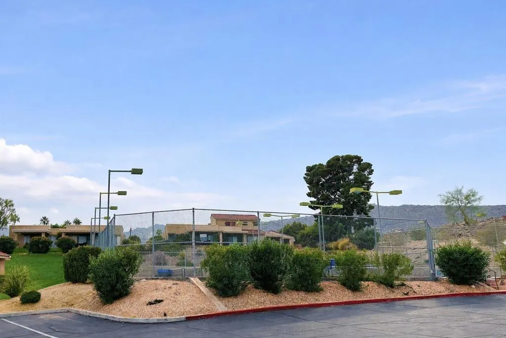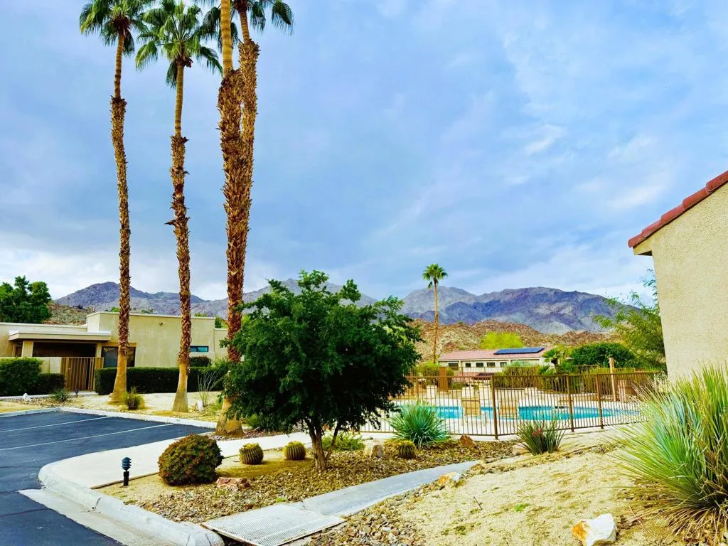 Ideally positioned as an end-unit residence, this beautifully maintained 2-bedroom, 1.75-bath condo offers an inviting blend of privacy, comfort, and thoughtful upgrades. Surrounded by mature landscaping, the home enjoys a rare grassy area directly adjacent to the patio, creating the feeling of a private yarda’perfect for relaxing, entertaining, or simply enjoying the desert sunshine.The kitchen has been remodeled with clean, contemporary finishes with Pental quartz counters, both functional and stylish. Just off the kitchen is a built-in office areaa’ideal for working from home, managing daily tasks, or creating a dedicated hobby or planning space without sacrificing living or dining areas.The undated interior is enhanced by high ceilings that add volume and an open, airy feel throughout the main living spaces. The living room flows seamlessly to the covered patio, extending the living area outdoors and providing a peaceful connection to the greenbelt just beyond.The primary bedroom is a comfortable retreat and features a remodeled en-suite bathroom with a walk-in shower, updated finishes, and a calm, spa-like feel. The guest bedroom is well-sized and conveniently located near the additional bathroom, making the layout practical for guests or everyday living.An air-conditioned, attached two-car garage is a significant feature, offering year-round comfort, generous storage, and direct access into the homea’often an uncommon convenience in condominium living.The community amenities are equally appealing. A pool is located just up the gentle hillside, while a pickleball/tennis court and a walking trail sit at the end of the quiet cul-de-sac, providing easy access to recreation without traffic or noise.Beautifully cared for and move-in ready, this end-unit condo offers a desirable combination of privacy, indoor-outdoor living, and a well-designed floor plan in a serene setting. An excellent opportunity for those seeking a low-maintenance lifestyle without giving up space, comfort, or connection to nature.