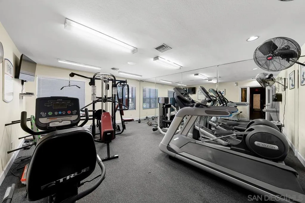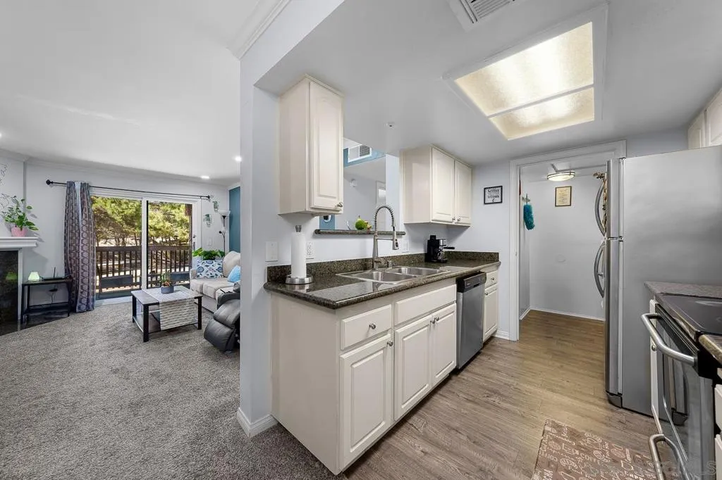 Welcome to this beautifully upgraded top-floor condo in the highly sought-after Poway Unified School District. This turnkey home is filled with natural light, has no neighbors above, and overlooks one of the serene pools in the community. Inside, you’ll find thoughtful updates throughout, including a newer central AC unit (installed last year), a brand-new water heater, newer recessed lighting, and a newer microwave. The spacious bathroom was remodeled in 2022 with a sleek modern tile shower, dual sinks, a stylish vanity, and enhanced plumbing to help prevent clogs. Additional recent upgrades include a newer shower pilot, a dual-pane balcony door for noise reduction & a dual-pane bedroom window complemented by plantation shutters. The balcony also features two sets of exterior blinds for added privacy and comfort, while a newer steel security door at the entry is perfect for letting in the breeze. One of the standout features is the full-sized in-unit laundry room that doubles as a pantry, a rare convenience in condo living. The community offers resort-style amenities, including two pools, a spa, gym, sauna, tennis/basketball court, and racquetball court. The location is truly unbeatable! Just steps from Rancho Bernardo High School and Rancho Carmel Village Shopping Center, and a short drive to Carmel Mountain Plaza, which boasts Costco, Trader Joe’s, Target, Sprouts, Home Depot, and countless other shops and dining options. Easy access to both the 15 and 56 freeways makes commuting a breeze. With its prime location, extensive upgrades, and highly desirable school district, this home is a rare find that combines comfort, convenience, and lifestyle.