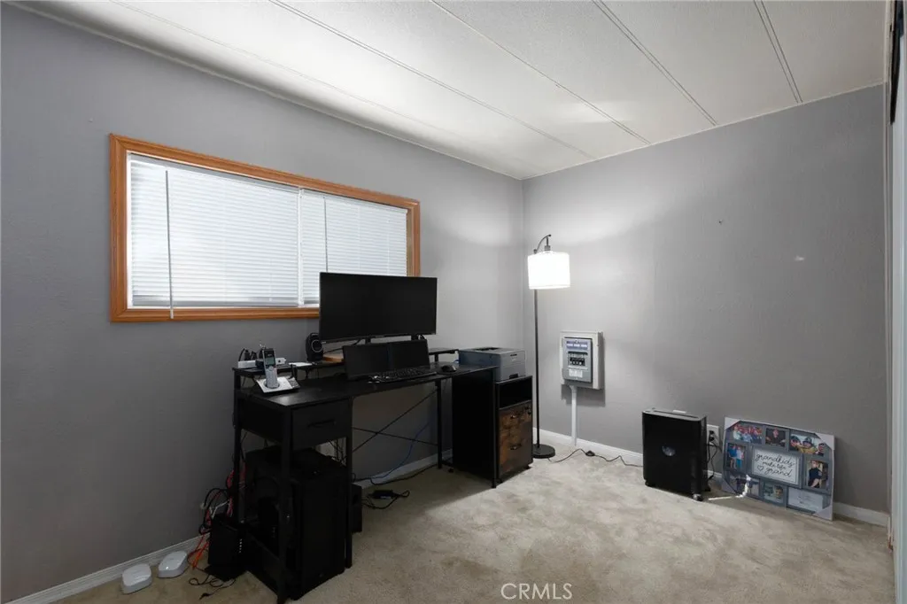 Beautiful and quiet 55+ community, Bel Air Estates, has fantastic amenities including a clubhouse, 2 pools, dog park, tennis court, fitness center, billiards, library, shuffleboard and lots of monthly community activities! This clean and upgraded home can be yours today boasting 2 bedrooms and 2 bathrooms, with inside laundry with washer and dryer included. Enter through the front porch into an open concept family room with vinyl flooring throughout, large windows with blinds and a newer paint job making this ready to move into now. The dining room is a good sized with built in China cabinet and entry into the kitchen. The kitchen is remodeled and looks modern with a stainless-steel sink, microwave and cabinet space with the laundry next to the door to the covered parking on the right side of the property. The parking has space for 2 cars and in the back is a newer shed ready for your projects and gardening supplies. The back yard is a blank slate for your dream garden, more storage or whatever you want to do with it. The orange tree produces lots of juicy and delicious oranges and the porch is perfect for relaxing and talking to friends, family and neighbors. Down the hall is the primary bedroom with ensuite and large mirror glass door closet, the primary bathroom with walk-in shower, vanity and toilet. The second bedroom or study has a closet and hall bathroom with shower, sink and plenty of storage. This community is located in the fastest growing town around, near the 215 highway, shopping and much more. This is a move-in ready home, in a great retirement community, with a price you cannot pass up! See it today!