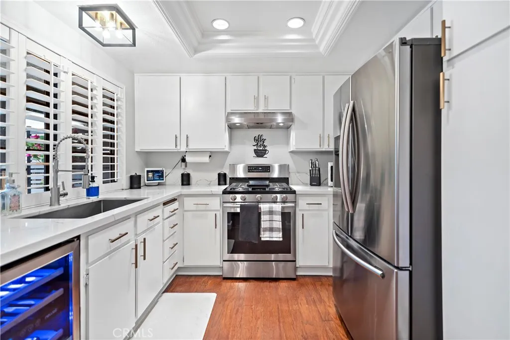 Charming, updated 3-bedroom, 2.5-bath condo located in the well-maintained Orchard Meadows community, ideally positioned facing the greenbelt for a quiet and private setting. This home features plantation shutters throughout and a bright, inviting kitchen complete with quartz countertops, stainless steel appliances, and a wine fridge. A convenient half bath is located just off the kitchen, along with hallway storage cabinets.