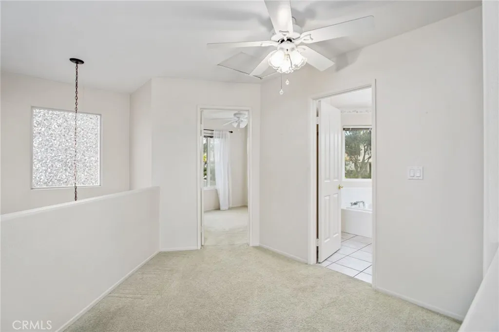 Price Improvement! Beautiful home in The Colony, a prestigious 55+ gated community in Murrieta. This 1,722 sq ft charmer features 3 beds, 2.5 baths, and a spacious 2 car garage with room for a golf cart, workshop, or extra storage. The Colony is known for its gorgeous golf course, incredible clubhouse, and top tier amenities. The HOA maintains the front yard, and the low maintenance/ low-water backyard is ready for your green thumb! Enter through double doors into a large, open foyer. To the right is the expansive family room with vaulted ceilings, abundant natural light, a cozy gas fireplace, and luxury laminate wood flooring. To the left, the dining room offers tile floors, large vinyl windows, and sliding doors leading to the covered patio and custom concrete porch with a convenient pass through to the kitchen. The upgraded kitchen includes a breakfast nook, ample storage, granite countertops and backsplash, and a boxed ceiling with recessed lighting for a modern feel. There is plenty of counter space and cabinetry for hosting family gatherings. Past the family room is the primary ensuite, featuring a spacious bedroom with vaulted ceilings, storage, and a full bathroom with a separate tub, stand up shower, dual walk-in closets, and a dual sink vanity with custom quartz countertops. Across the hall, the utility room includes cabinetry, a sink, and included washer and gas dryer. The upgraded half bath offers granite countertops and a large mirror. Upstairs are two well sized bedrooms, a shared bath with storage, tub, and vanity, plus a perfect nook for a desk or study area. Outside, enjoy a beautifully maintained fenced yard with a large, covered patio, custom brick inlay concrete, and walkways all around easy to access, maintain, and personalize! The Colony’s newly remodeled clubhouse offers a pool, spas, fitness center, billiards, lighted tennis and paddle tennis, hair salon, library, cards, shows, events, and of course, the stunning golf course! Close to shopping, groceries, Reading Cinemas, Kaiser, the 1-15 and I-215, this ideal location paired with a low tax rate of around 1.2% makes this GEM a must see!