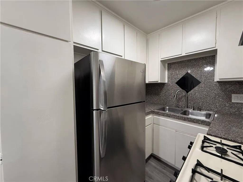 The kitchen is equipped with granite countertops, a refrigerator, and a stove, along with plenty of cabinet space to meet your storage needs. The bedroom offers an efficient layout with a large closet and a vanity area, providing both comfort and functionality.