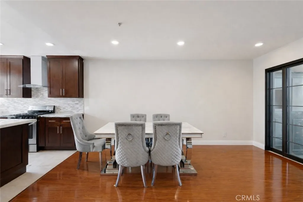 The kitchen includes granite countertops, a small center island, mosaic tile backsplash, wood cabinetry, and stainless steel appliances. Living and dining areas connect seamlessly and provide access to a private balcony. Both bathrooms have been updated.