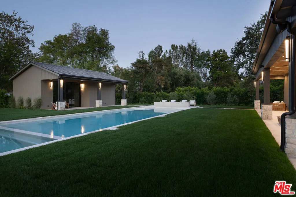 Behind the gates of Hidden Hills, where privacy meets prestige, lies a modern farmhouse of exceptional warmth and character. Designed for those who love to entertain and live beautifully, this residence spans approximately 12,780 sq.ft. of living space and (over 15,000 sq.ft. total including garage and covered patios), blending natural textures with thoughtful architectural details. A circular driveway leads to a grand entry foyer that opens to sun-filled living spaces, an inviting family room with glass wine displays, an elegant dining area with cocktail bar, and a luxurious family kitchen featuring dual counter islands additional full chef’s prep kitchen, and walk-in pantry. The main level also includes an office with a glass-enclosed car gallery and a private guest suite. The lower floor/basement level is devoted to wellness and leisure, offering a gym with steam shower and sauna, glass sliding doors opening to a tranquil outdoor patio, a theater room, bar with counter seating, and lounge area with big screen TV, guest/maid suite, and a secure safe room. Upstairs, the primary suite features a private balcony, dual walk in closets, and a spa-like bath, accompanied by four additional en-suite bedrooms and a laundry room. Outdoors, a resort-style setting awaits – with a vast pool and spa, outdoor dining and BBQ pavilion, lush lawns, mature trees, and a separate one-bedroom, one bathroom ADU. A six – car garage, with an additional six parking spaces complete this extraordinary estate, crafted for elegant living in one of Los Angeles’ most coveted gated communities. Option to purchase the adjacent vacant lot at the rear, offering potential to expand parking, accommodate horses, or build a guest house or residence with RTI plans. Option to purchase back vacant lot, for car gallery, guest house horses, guest house , additional house many option for additional $3.6M