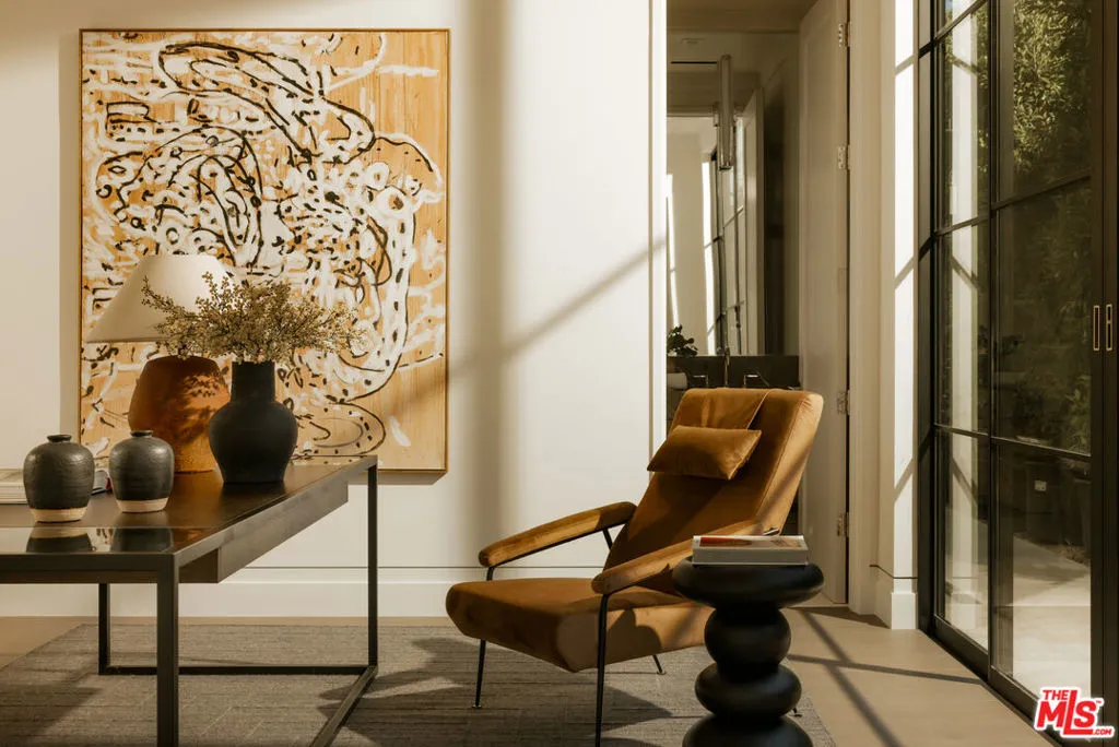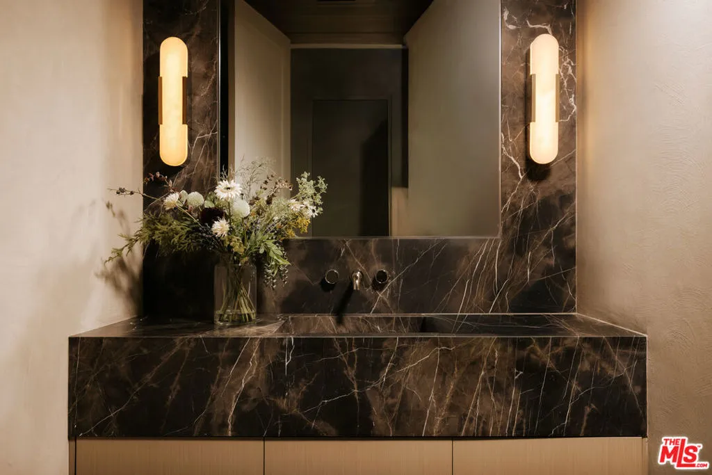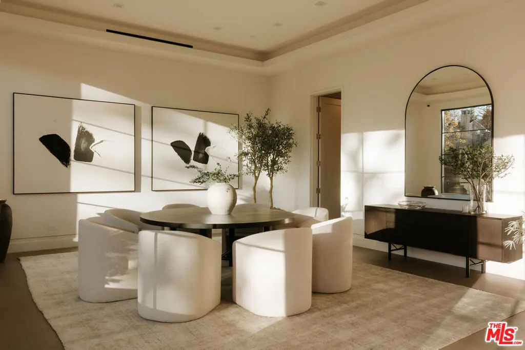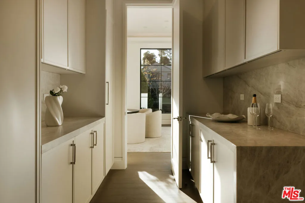 Set behind gates on one of Brentwood’s most coveted streets, this newly completed estate by architect Philip Vertoch and designer Magni Kalman embodies timeless sophistication and modern refinement. Thoughtfully designed to balance grandeur with livability, the home unfolds across 9,515 square feet of light-filled interiors, complemented by a beautifully appointed guest house and expansive, resort-like grounds. A striking double-height entry, crowned by a skylight, creates an immediate sense of arrival — welcoming in natural light and setting the tone for the exceptional craftsmanship found throughout. Classic brick architecture, soaring ceilings, steel-framed windows and doors, and artisanal millwork blend seamlessly to create a sophisticated yet inviting atmosphere. Designed for both intimate moments and grand entertaining, the main level flows effortlessly from formal living and dining spaces to an expansive family room and chef’s kitchen, where European-style cabinetry, Taj Mahal natural stone countertops, and premium Wolf appliances anchor the heart of the home. Upstairs, the primary suite is a sanctuary, complete with a sitting room, dual-sided fireplace, private terrace, dual dressing rooms, and a stone-clad ensuite with a dual shower and soaking tub. Outdoors, nearly half an acre of manicured grounds provides a backdrop for elevated entertaining, featuring an outdoor kitchen, pool, spa, cold plunge, and sundeck, while the guest house offers versatile space for hosting, wellness, or extended stays. Enhanced by full home automation, supremely equipped for in-home staff, and set moments from Brentwood’s finest dining, shopping, and the coast, this residence delivers luxury living with discernment.