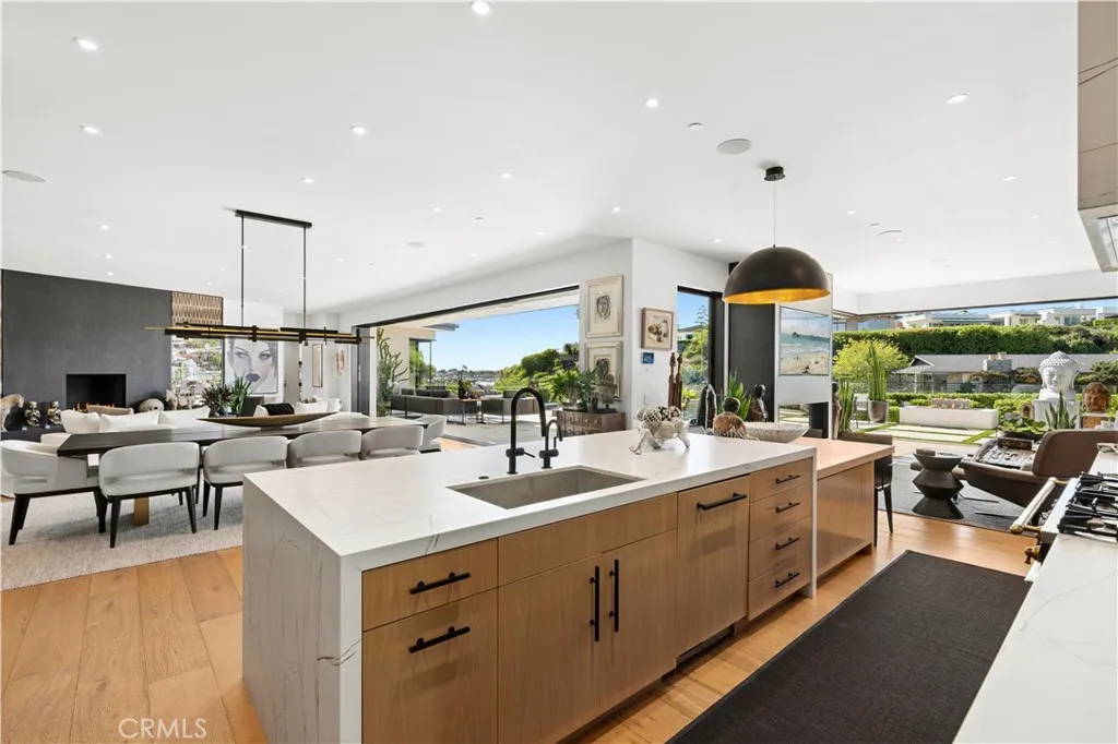 The open-plan design connects every space with light and views. Pocketing glass walls erase boundaries, pulling in natural light and framing the harbor and ocean beyond.