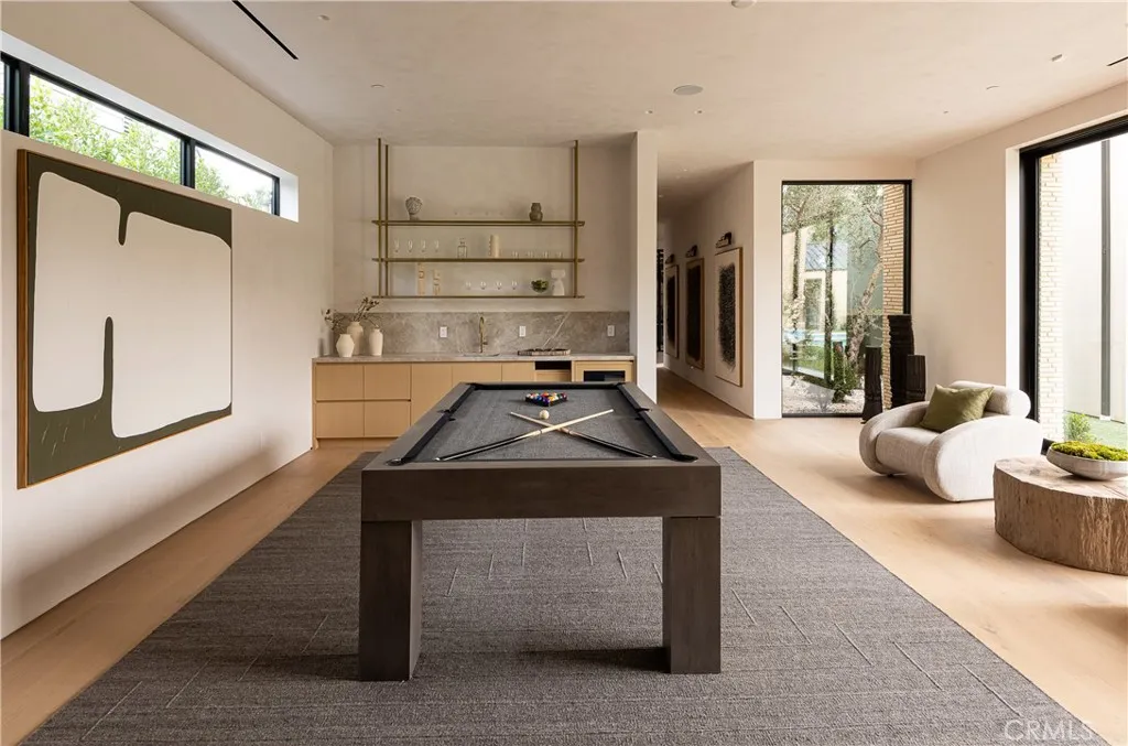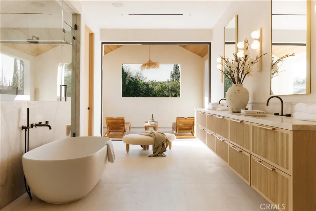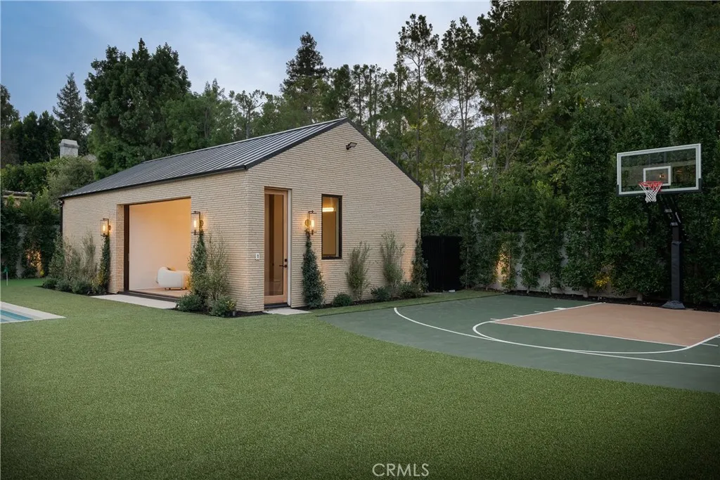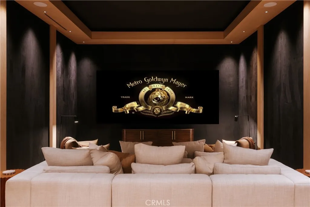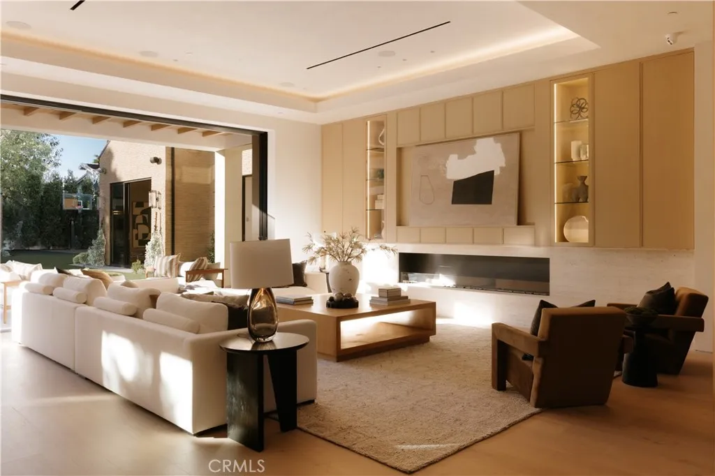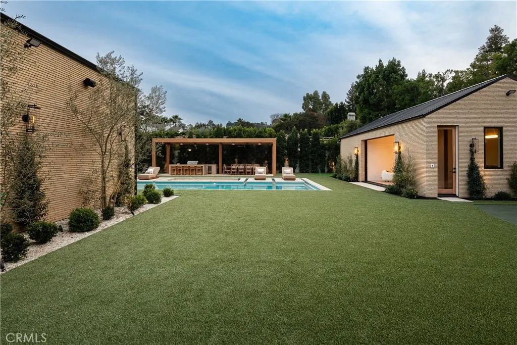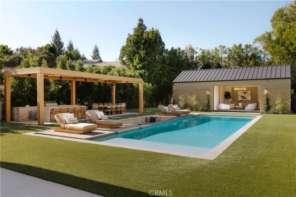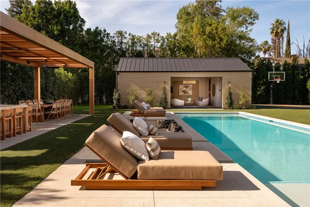 Introducing a masterfully crafted gated estate that redefines luxury living, privacy, and scale in the heart of Encino’s prestigious Royal Oaks enclave. Designed by acclaimed architect Eran Gispan and elevated by bespoke interiors from Sophea Design, the residence delivers a seamless balance of modern sophistication and resort-style living—crafted at the highest level. A grand circular motor court with paver detailing, and two mature olive trees creates a timeless sense of arrival and privacy. Inside, soaring two-story ceilings, hand-applied plaster walls, and warm wood detailing frame a light-filled, open floor plan. Wide-plank white oak floors extend throughout the entire home. The kitchen is a true statement of form and function, anchored by a double island wrapped in dramatic Calacatta Viola marble, Custom white oak cabinets, premium Miele appliances, and a separate prep kitchen with walk-in pantry. Adjacent to the dining area, a serving bar with limestone countertops and backsplash enhances entertaining flow, while the family room is defined by a sculptural travertine stone. The main residence features six bedrooms, all en-suite, in addition to an office, a dedicated movie theater, gym, lounge and game room. The primary suite is a private sanctuary, highlighted by a private balcony and a spa-inspired bath wrapped in leathered Taj Mahal stone, complete with a skylit shower that fills the space with soft natural light. Designed for year-round enjoyment, the grounds unfold as a true private resort. The expansive backyard includes an oversized pool with spa, sunken firepit, basketball court, putting green, generous grassy yard, and a fully equipped outdoor kitchen and barbecue—ideal for both intimate evenings and large-scale entertaining. Completing the compound is a detached guest house featuring one bedroom, one bathroom, and a living area, offering exceptional flexibility for guests, extended family, or a private studio. Additional highlights include a four-car garage, expansive gated driveway, exceptional privacy throughout, and a full Control4 smart-home system managing lighting, climate, interior and exterior audio, alarm system, and security cameras. Located moments from Ventura Boulevard’s premier dining and boutique shopping, and within the highly coveted Lanai Road School District. This one-of-a-kind estate offers the scale of a private compound, the sophistication of a designer residence, and the lifestyle of a world-class retreat.