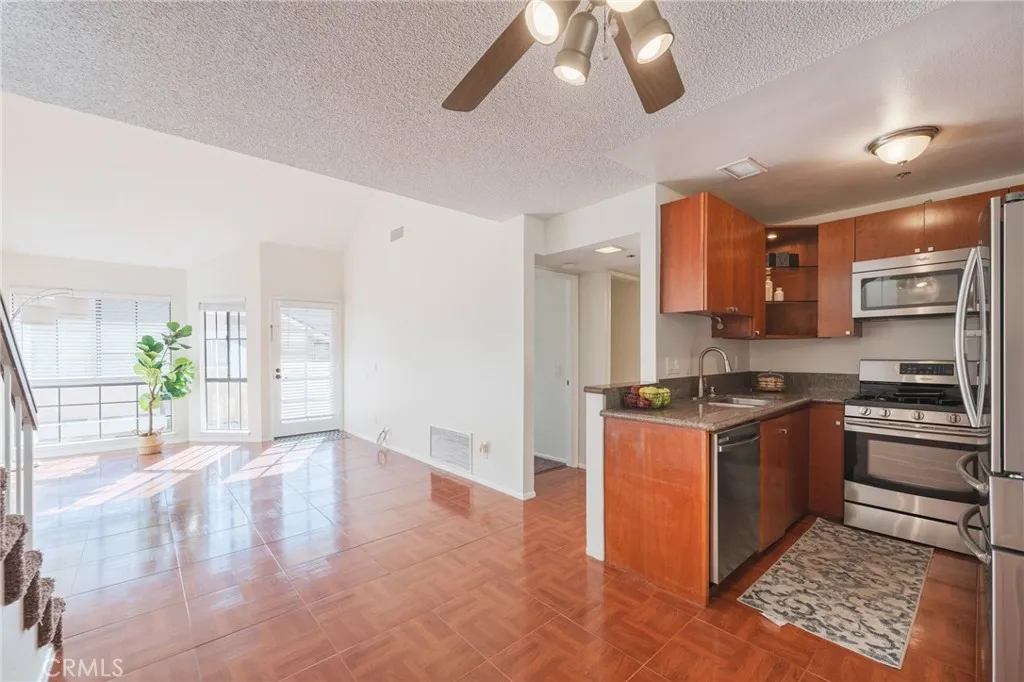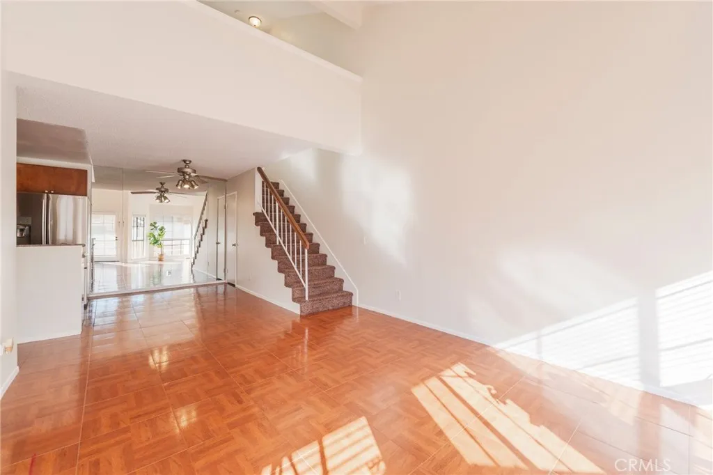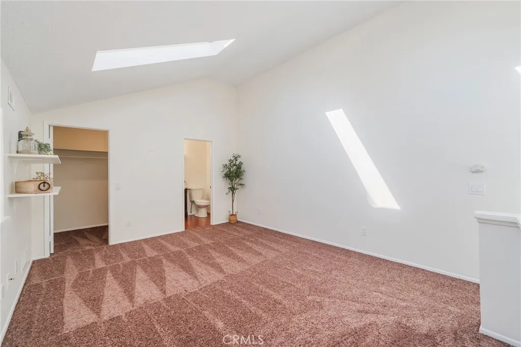 The thoughtful floor plan features a main-level bedroom with dual closets and a full bathroom with a double-sink vanity. For ultimate convenience, the unit includes an inside laundry area with a stackable washer and dryer hookups. Upstairs, you will find a spacious and airy loft illuminated by newer skylights, offering a massive walk-in closet and a private half-bath—perfect as a primary suite or home office.