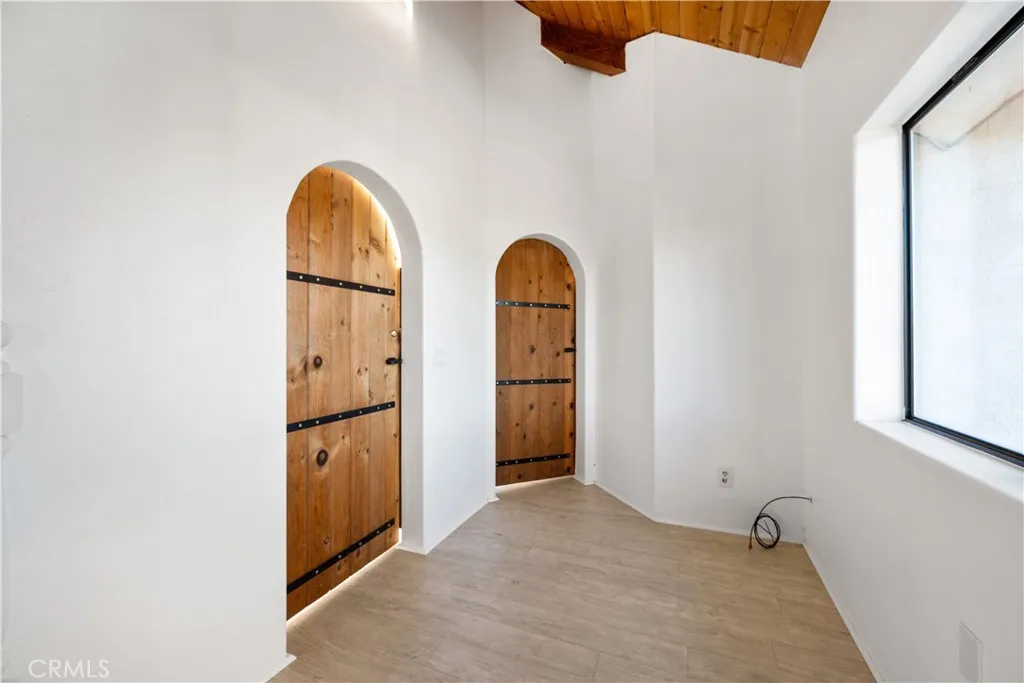 A long private driveway leads to a peaceful arrival featuring a fire pit, waterfall cascading into a fish pond, and a small orchard with a variety of fruit and citrus trees—a setting that feels worlds away while remaining conveniently located. Inside the main home, timeless architectural details include graceful archways, wood-beamed ceilings, skylights, and expansive windows that flood the home with natural light. Multiple view balconies provide the perfect backdrop for morning coffee or sunset evenings.