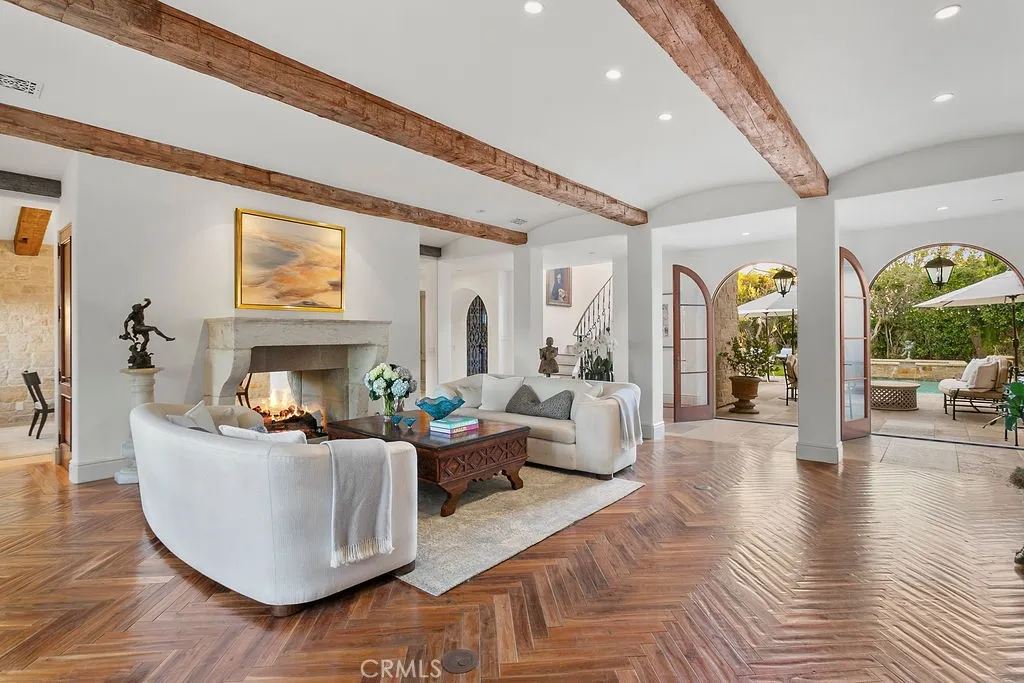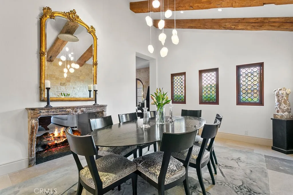 The interiors unfold through a light-filled, open-concept floor plan that seamlessly connects the main living spaces, all framed by a lavish pool and garden setting. Designed for both effortless entertaining and quiet retreat, the living and dining areas exude warmth, scale, and polish. At the heart of the home, the chef’s kitchen is equipped with top-tier appliances and custom cabinetry, flowing naturally into the surrounding gathering spaces—perfect for summer evenings spent indoors or out.