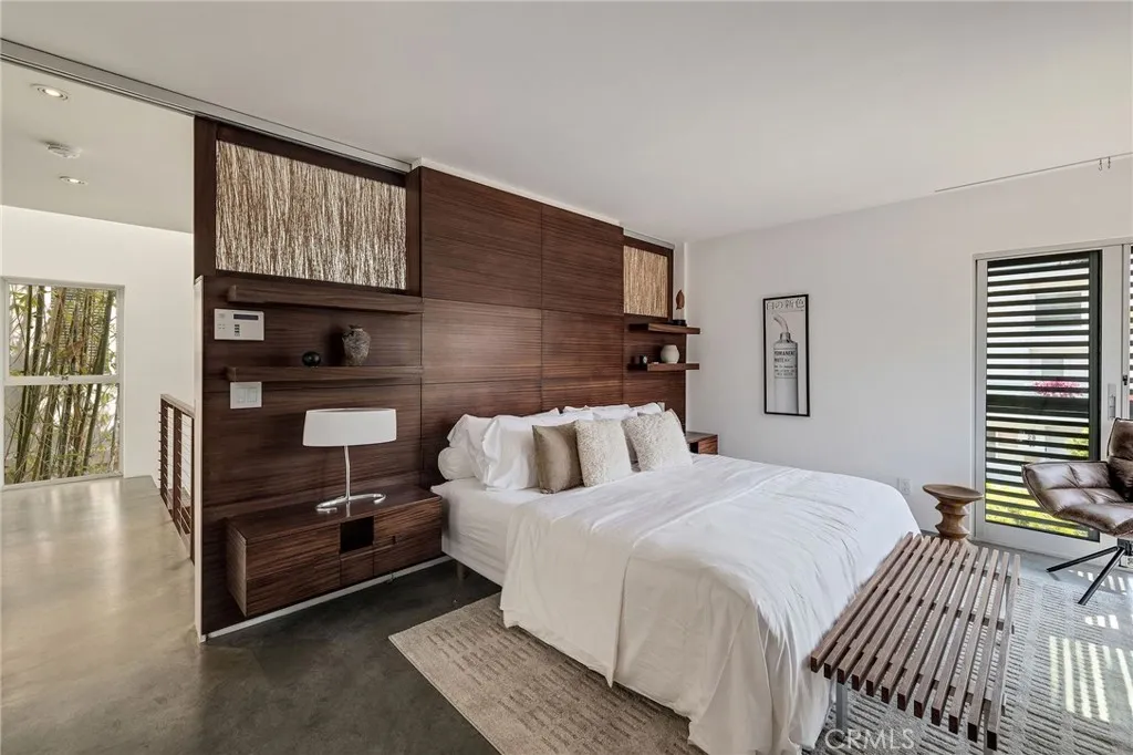 The open-concept first floor features radiant-heated concrete floors and a gourmet Henrybuilt kitchen with quartz countertops, a large central island, and ample storage. The adjacent family room with sectional seating and flat-screen TV opens to a private outdoor lounge with a sparkling pool, jacuzzi, and lush landscaping. The living room features Italian furnishings, a 70-inch TV, and sliding glass doors leading to a tranquil courtyard. The dining area comfortably seats eight.