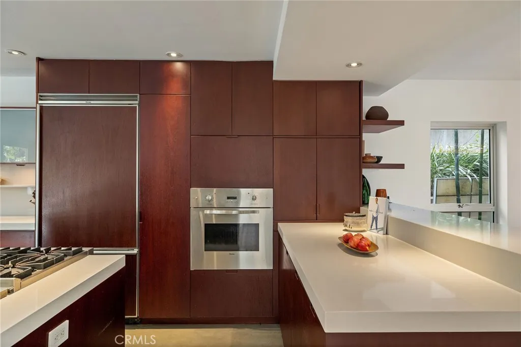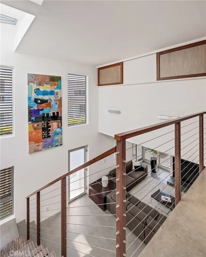 The home is outfitted with original international artwork, a dramatic floating ipe slat staircase illuminated by skylights, extensive built-ins, smart home systems, a two-car garage, and three extra parking spaces.
