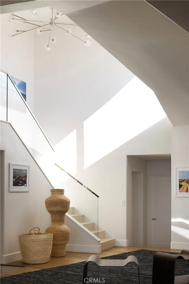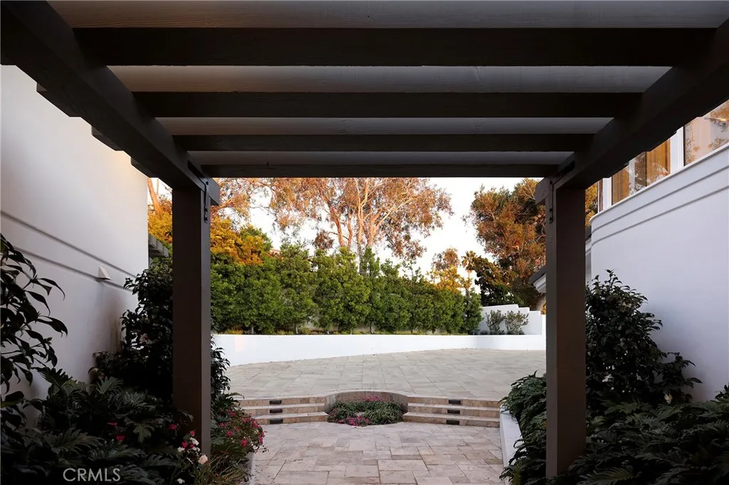 Sited at the very end of North Portola, this custom home sits at the end of a shared drive which leads to a large privately gated paver-lined motor-court. A large steel and glass entry door opens towards the ocean, offering a substantial view of The Pacific upon entry. A great room with soaring ceilings is lined with bleached oak flooring across the open concept living spaces with some of the very best views in Lower Three Arch Bay from nearly everywhere in the home. A chefs kitchen offers an oversized kitchen island with large built-in breakfast area, natural stone countertops, a stainless steel appliance suite with six burner stove, a walk-in pantry, an ice maker, and dramatic vistas up the coastline. Two of the four bedroom suites are on the main level, each offering a private bathroom. One of the two offers ocean views and separate access from a private patio with waterfall fountain. Two additional bedrooms are located on the second level, each accessed by separate private stairways. The primary suite includes a view terrace as well as a spa-like bathroom with a freestanding soaking tub illuminated by an overhead skylight, a walk-in shower, and a large walk-in closet. A secondary private suite accessed by a window-lined architectural stairway offers two separate terraces, including one with ocean views, as well as a walk-in closet. A Pebbletec pool & spa with limestone tiled pool deck on the view-side of the home offers outstanding sun exposure and has unmatched views of the Laguna Beach Coastline, Catalina Island, year-round sunsets, and beyond.