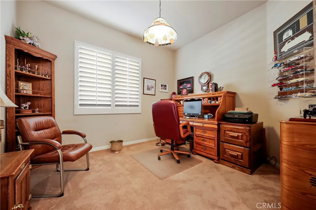 An elegant etched glass front door opens to a formal and inviting entry setting the tone for the quality found throughout the home. The thoughtfully designed floor plan offers a seamless flow into the spacious living and dining areas, perfect for entertaining or everyday living. A dedicated den/office provides flexible space for work or hobbies. The large open kitchen is the heart of the home, featuring a center island, granite countertops, stainless steel appliances, breakfast bar and a sunny breakfast area. Designed for both function and style, it opens effortlessly to the main living areas. The generous primary suite offers a private retreat, complete with a large walk-in closet and an en-suite bath featuring dual sink vanities, a separate soaking tub and a walk-in shower. A well-appointed guest bedroom with its own bath ensures comfort for visitors, along with an additional powder room for convenience. Additional highlights include crown molding and custom plantation shutters throughout, a separate laundry room with ample storage, and a 3-car garage with built-in storage cabinets. The professionally landscaped front and backyard offer beauty and privacy, while the backyard is designed for easy desert living with drought-resistant landscaping and a covered patio, ideal for relaxing or entertaining outdoors.