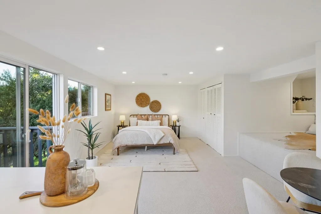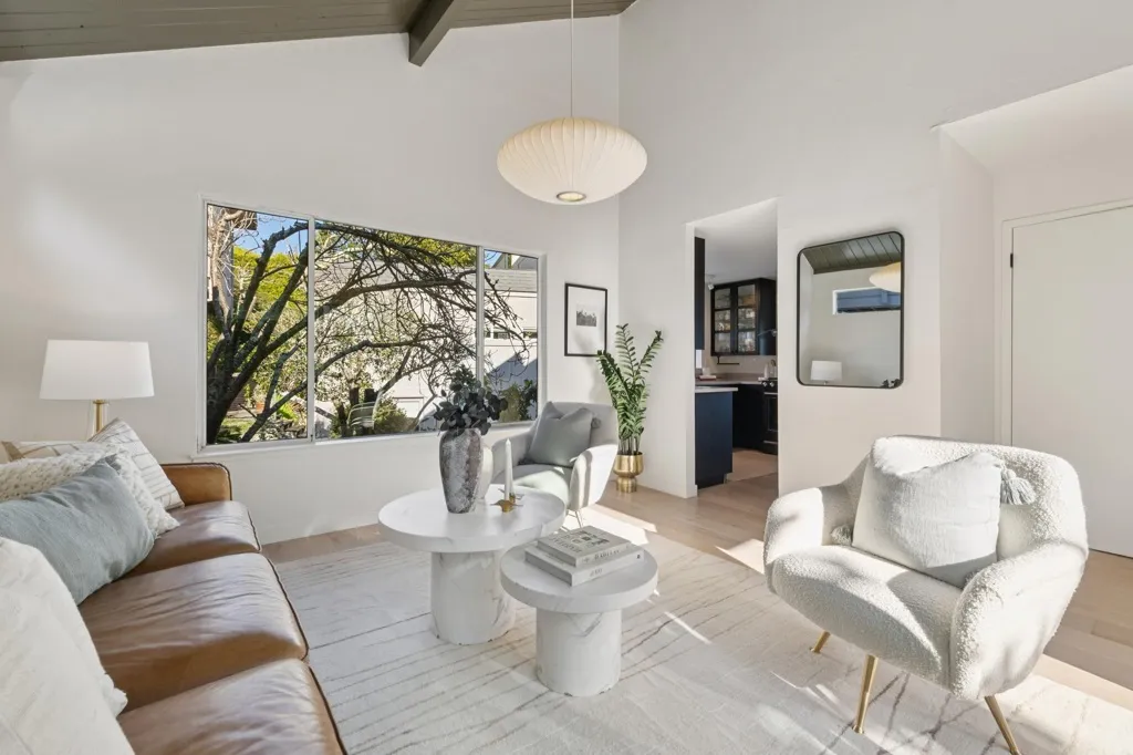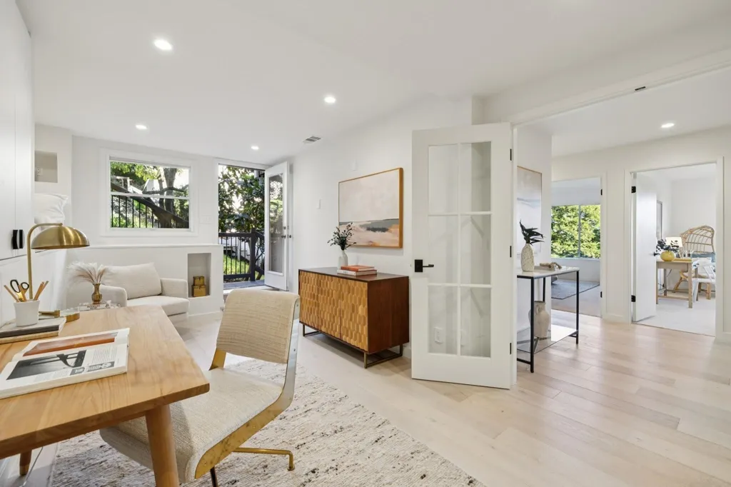 This elegant Mill Valley home captures serene sunrise views over tree-lined hills and valleys, blending natural beauty with modern comfort. Step outside to direct access to the Miwok Trail and the Golden Gate National Recreation Area. The home is tucked away at the end of a quiet cul-de-sac and features a spacious 4-bedroom, 3.5-bath layout, including a versatile lower-level unit with its own kitchen, bath, private entrance, and deck—ideal for guests or home office use. Inside, the refreshed living spaces are graced with large windows, skylights, and a seamless open-concept main level where living and dining flow onto a deck with expansive canyon views. The upper floor offers a private sanctuary in the primary suite, complete with its own deck. The middle floor includes two bedrooms, a full bath, a laundry room, and ample storage. The welcoming front porch and multiple decks offer perfect spots for outdoor dining or relaxing. Just minutes from Tamalpais Valley Elementary, Tam Junction, and neighborhood favorites like Good Earth Natural Foods, this home combines natural tranquility with easy access to Highway 101 and a simple San Francisco commute.