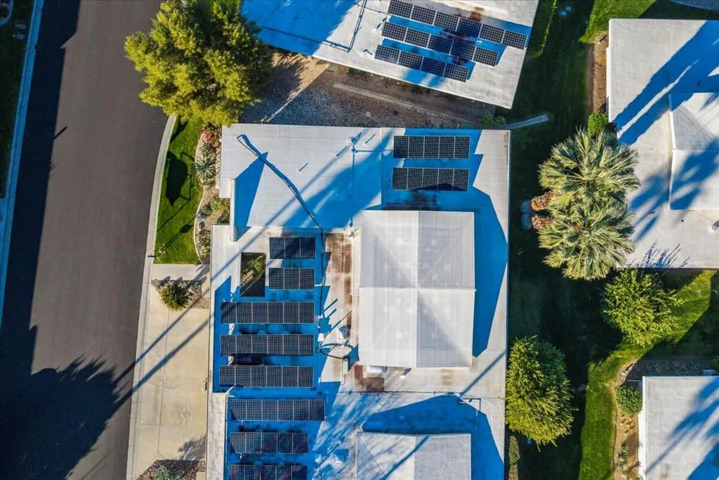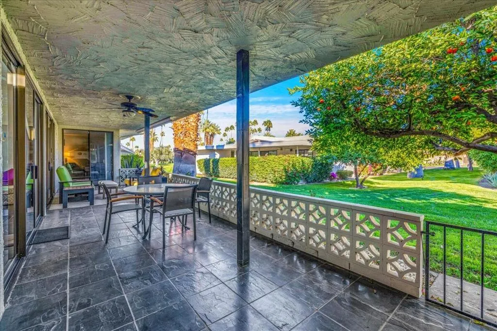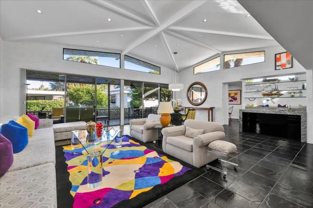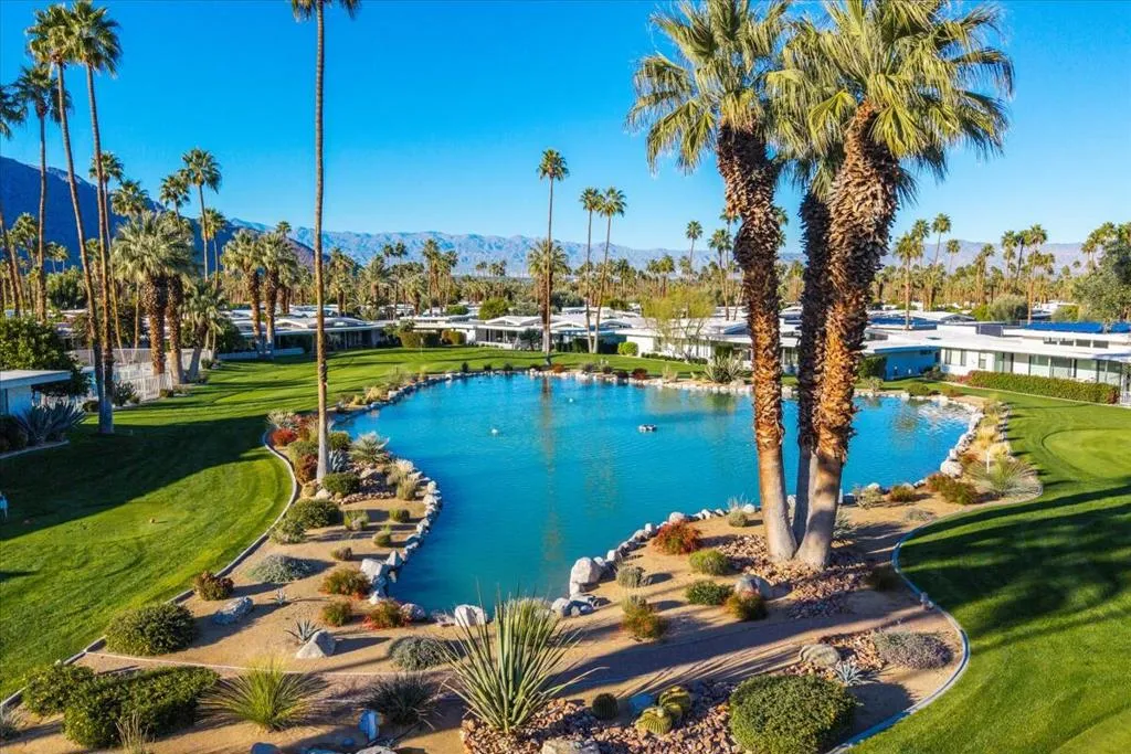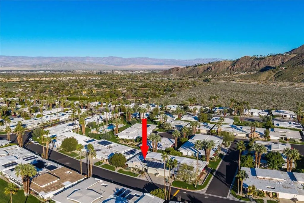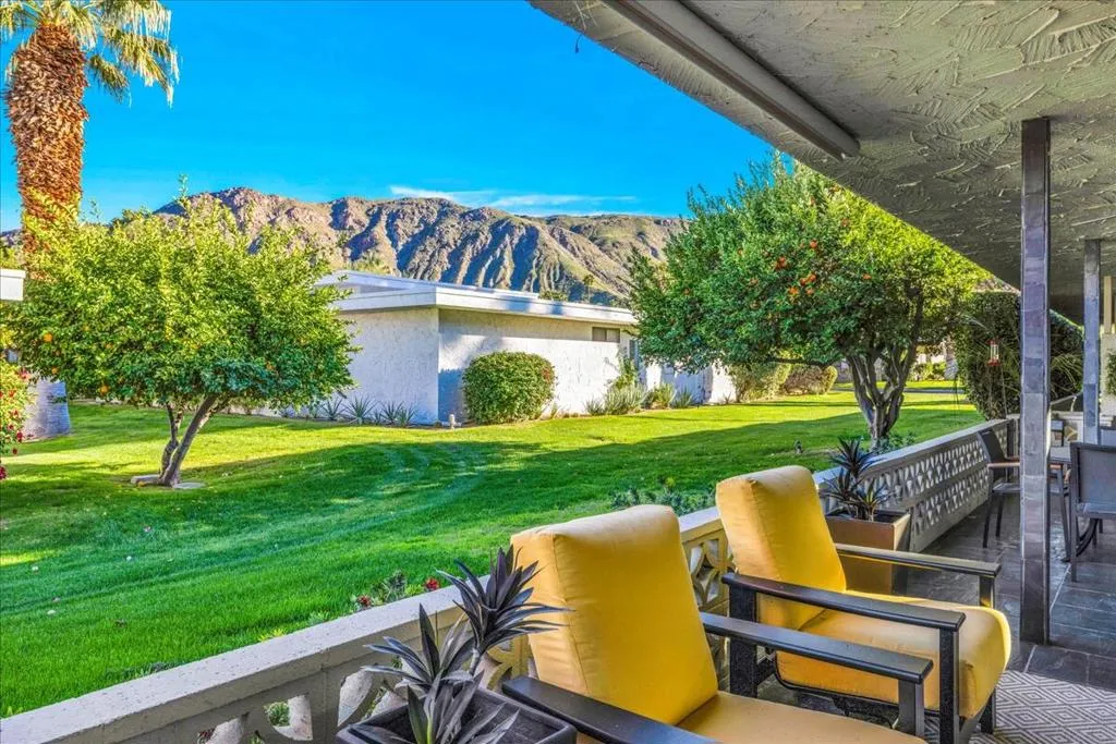 Mid-Century living in Canyon Estates by architect, Charles E. Du Bois. Enter through double-doors to a foyer that opens to a stunning living room, complete with a signature umbrella open beam style ceiling. Walls of glass and iconic clerestory windows invite abundant natural light. Adjacent is a large, comfortable media room. Kitchen and half bath have been completely remodeled. The covered patio overlooks a greenbelt with the mountains beyond – The home is ideal for indoor, outdoor living. The generous primary bedroom opens to the patio, attached primary bath with convenient washer and dryer completes the suite.Additional features include an attached 2 car garage, leased solar all on FEE LAND! Home is fully furnished and furnishings are included in the sale.Canyon Estates amenities, including 15 pools, 12 spas, tennis and pickleball courts, a PAR-3 golf course, and a clubhouse with a newly upgraded fitness center.