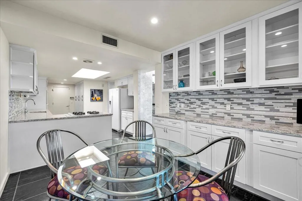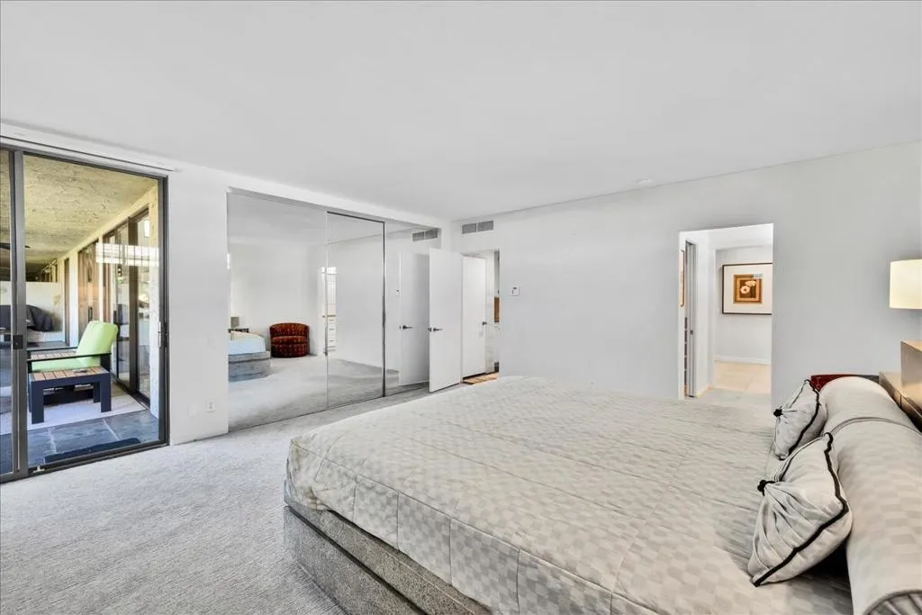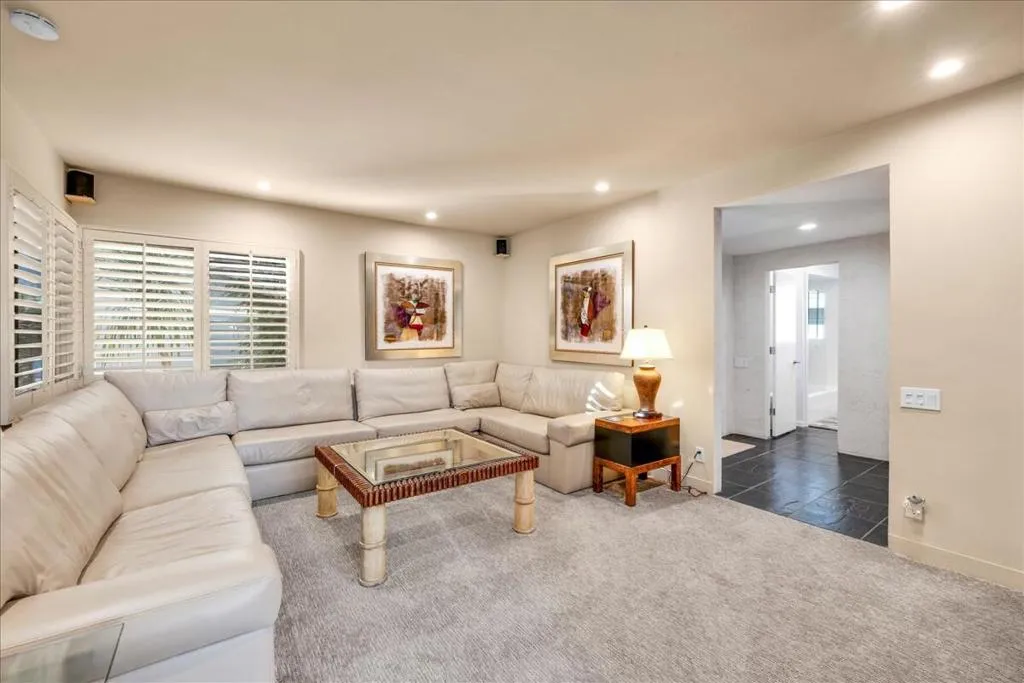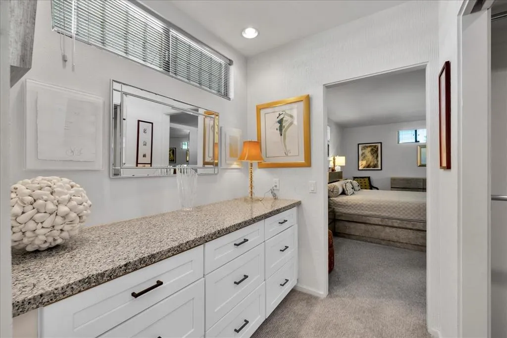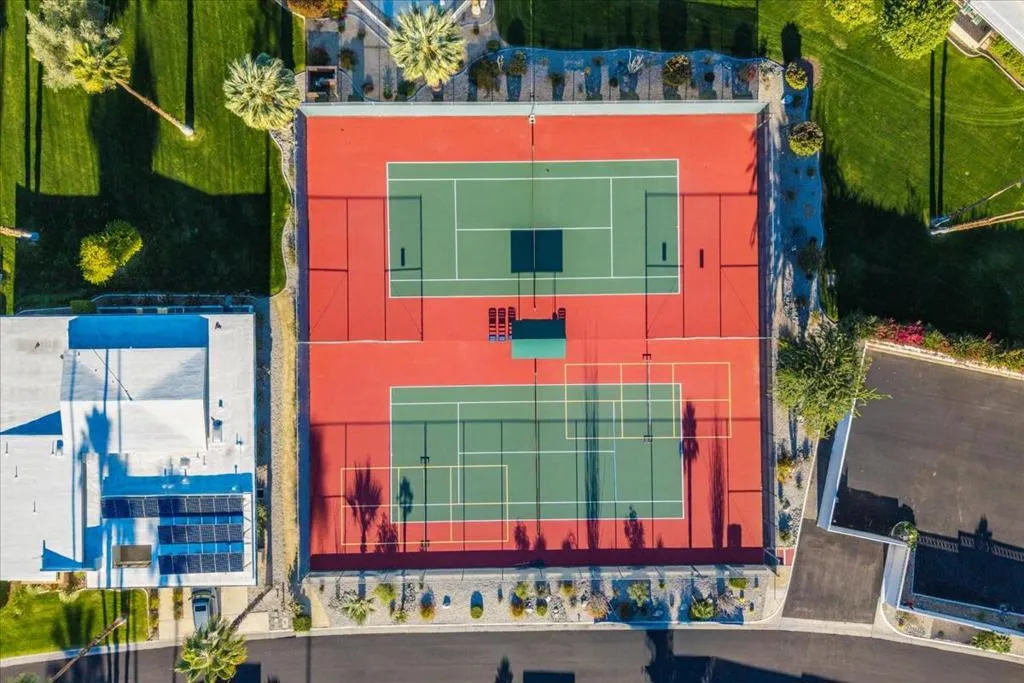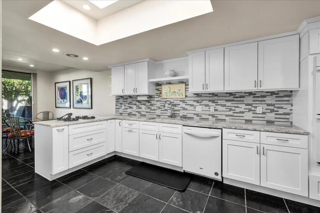 Mid-Century living in Canyon Estates by architect, Charles E. Du Bois. Enter through double-doors to a foyer that opens to a stunning living room, complete with a signature umbrella open beam style ceiling. Walls of glass and iconic clerestory windows invite abundant natural light. Adjacent is a large, comfortable media room. Kitchen and half bath have been completely remodeled. The covered patio overlooks a greenbelt with the mountains beyond – The home is ideal for indoor, outdoor living. The generous primary bedroom opens to the patio, attached primary bath with convenient washer and dryer completes the suite.Additional features include an attached 2 car garage, leased solar all on FEE LAND! Home is fully furnished and furnishings are included in the sale.Canyon Estates amenities, including 15 pools, 12 spas, tennis and pickleball courts, a PAR-3 golf course, and a clubhouse with a newly upgraded fitness center.