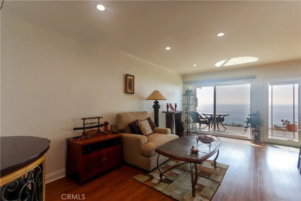 View, View, View! Located directly across from the Montage Resort, this single-level, 2-bedroom, 1-bath condominium offers ocean views from the kitchen, dining area, and living room. The open floor plan features large windows that provide natural light and highlight the surrounding coastal setting. Interior features include updated flooring, granite countertops, custom cabinetry, and remote-controlled window shades. The unit includes a private front porch with ocean-facing seating space, as well as a separate rear patio offering additional outdoor area. The floor plan consists of two bedrooms and one full bathroom. Community amenities include landscaped common areas, a swimming pool, and a clubhouse. The property also includes a detached one-car garage. Conveniently located near beaches, coastal walking paths, restaurants, and local amenities, this property presents an opportunity for coastal living in Laguna Beach.