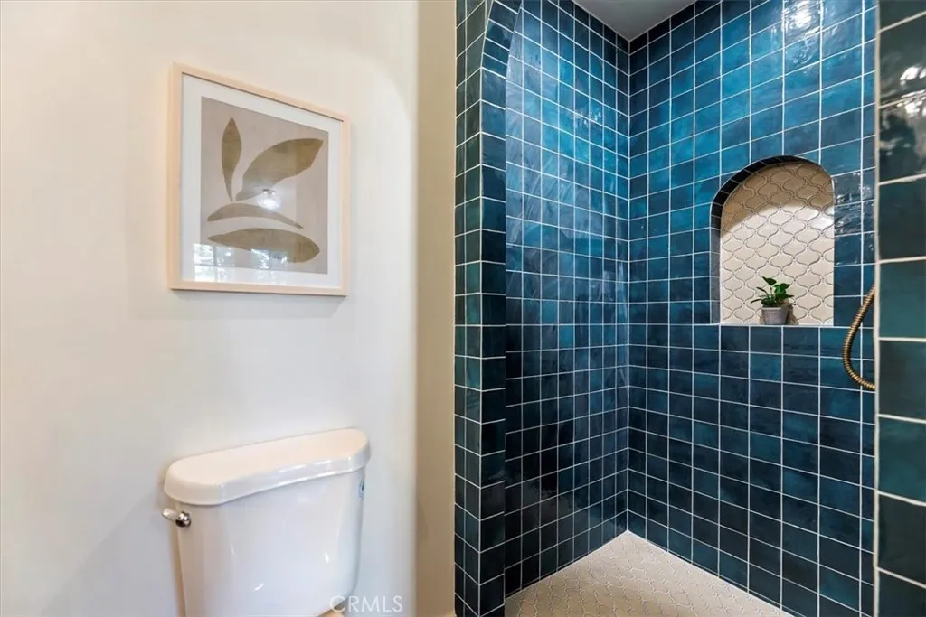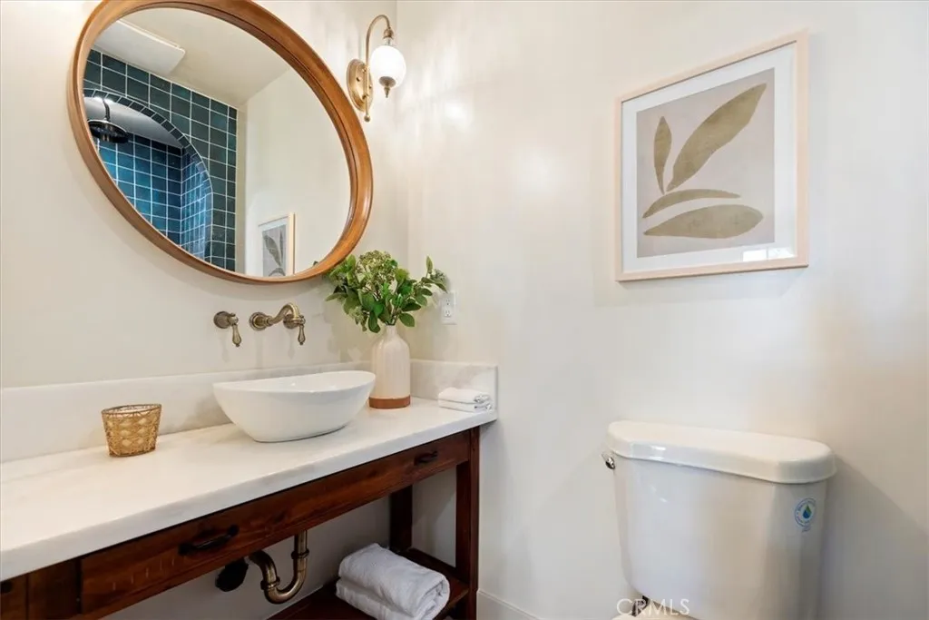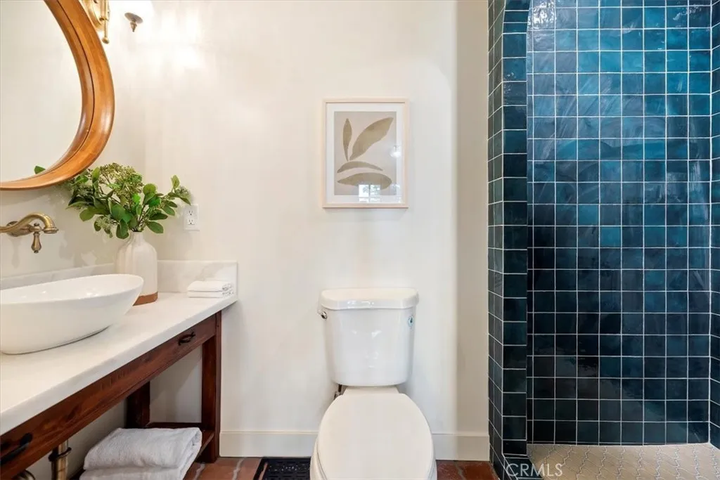 Inside, the home features original restored wood flooring complemented by terracotta Riviera tile in the kitchen and bathrooms, enhancing its warm Spanish aesthetic. The custom kitchen showcases built-in appliances, soft-closing cabinetry, and stone countertops, while the bathrooms feature coordinating stone surfaces, custom vanities, and antique brass faucets throughout, creating a cohesive and elevated design. The layout is ideal for indoor-outdoor living, with French doors in two of the bedroom opening directly to the backyard, filling the home with natural light and creating seamless access to outdoor spaces.
