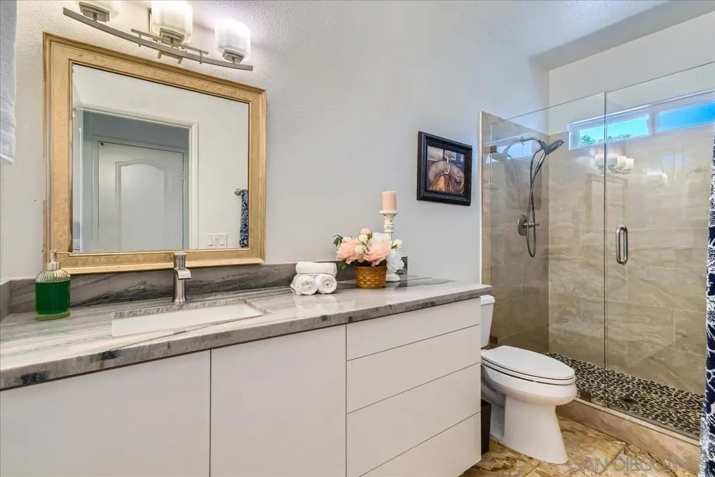 Rare newer single-story home with soaring 9-foot ceilings in the highly desirable Poway Unified School District. This beautifully maintained 3-bedroom, 2-bath residence features a bright open floor plan with premium upgrades throughout. Enjoy owned solar with wall battery, EV charger, and brand-new A/C, water heater, and garage motor for modern comfort and efficiency. The high-end custom kitchen shines with oversized wood cabinetry and luxurious jade natural-stone countertops. Elegant engineered hardwood flooring, a natural skylight, and oak window shutters add warmth and sophistication. Additional highlights include a whole-house water filtration and softener system. Relax or entertain in the private covered patio with peaceful views. The spacious primary suite offers two walk-in closets. No HOA and No Mello-Roos! Conveniently located minutes from Costco, Home Depot, Lowe’s, Walmart, and a wide selection of dining options—this home truly has it all.