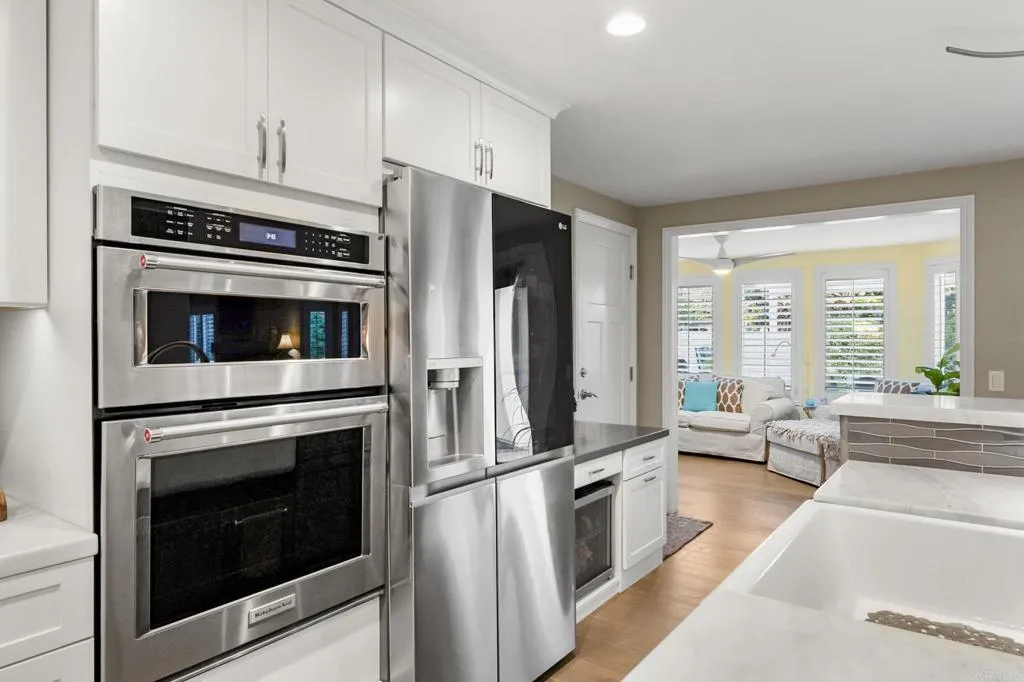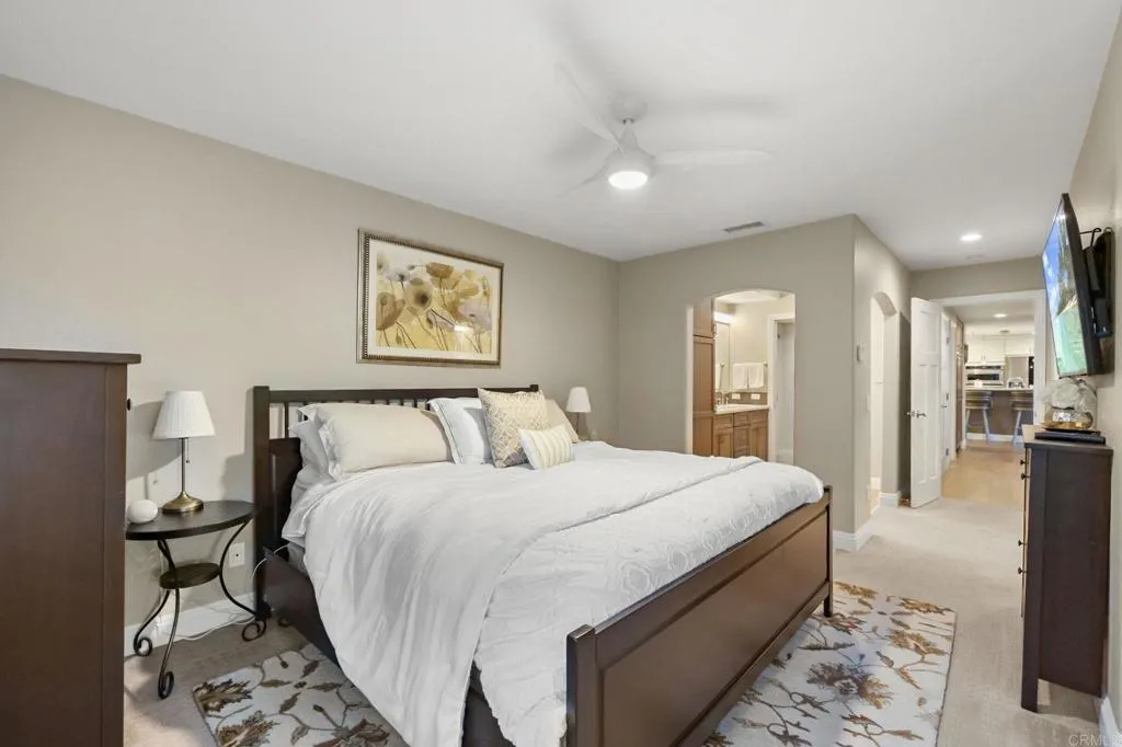 Gated community. This beautifully upgraded home offers a perfect blend of luxury, comfort, and modern convenience. Privacy shutters throughout provide style and tranquility, while carpeted bedrooms add warmth and comfort. Wood flooring flows seamlessly through the main living areas, creating an elegant and timeless look.The loft opens to a private second-story deck with a retractable awning, ideal for relaxing or enjoying San Diego’s year-round outdoor lifestyle. The landscaped yard is designed for both beauty and efficiency, featuring path lighting on a timer and a water-saving drip irrigation system that services the vertical herb garden and all surrounding plants. Additional highlights include an expansive attic storage area above the garage with a folding stairway, a spacious two-car garage, and wiring for a Level 2 (240-volt) electric vehicle charger—perfect for today’s modern homeowner. This is a home that has been thoughtfully cared for and upgraded throughout. A must-see property—schedule your private showing and come experience it for yourself.