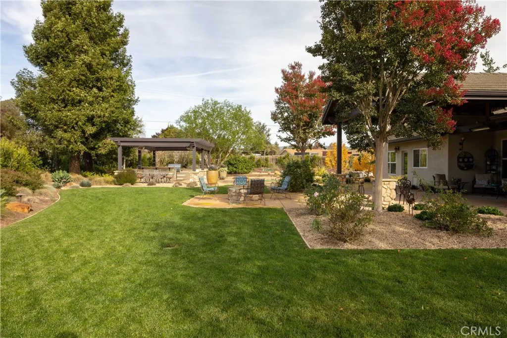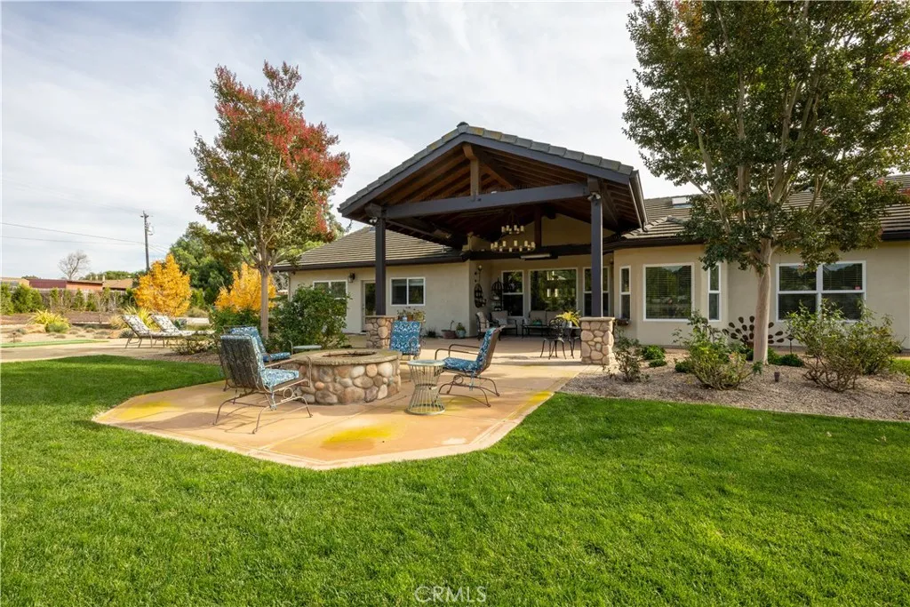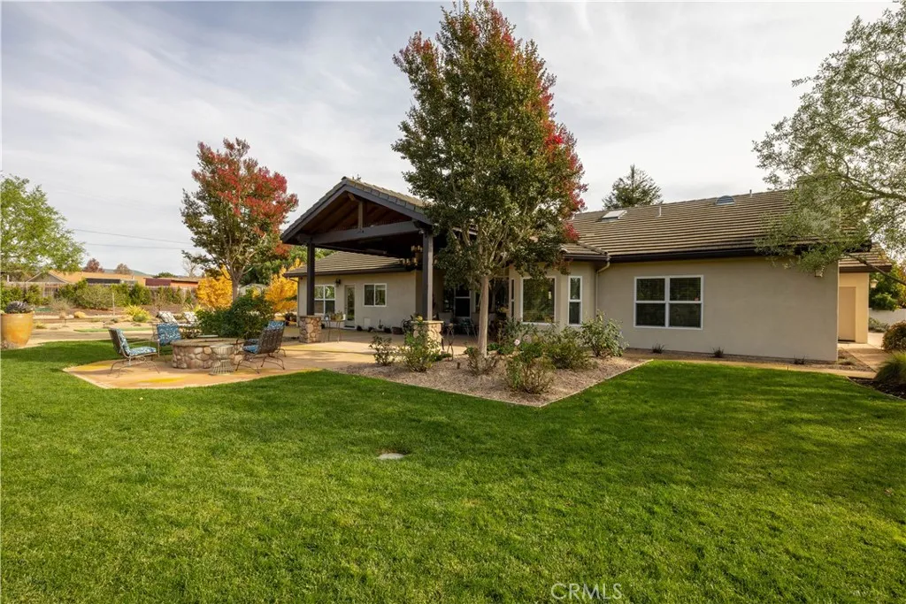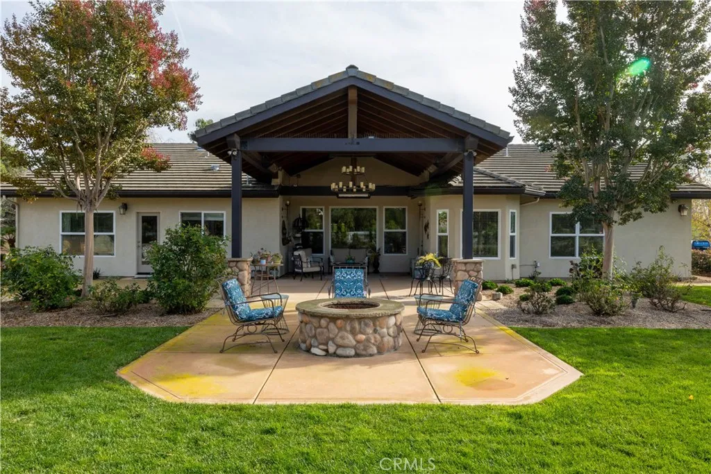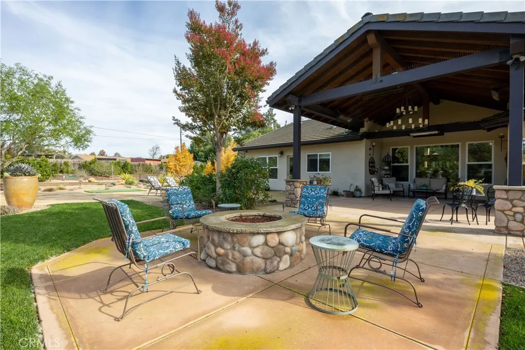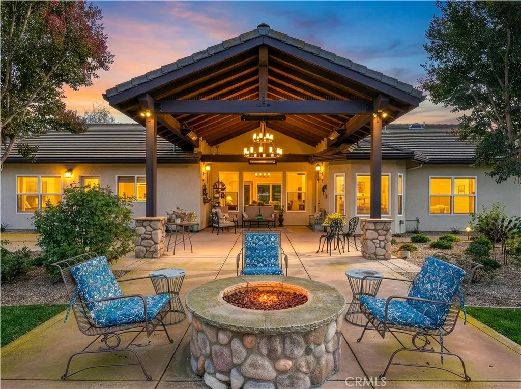 Set on a generous and fully usable 1.01-acre lot, this meticulously maintained 3-bedroom plus den (optional 4th bedroom), 2.5-bath home offers 2,657 square feet of comfortable living paired with exceptional indoor-outdoor amenities. Luxury vinyl plank flooring flows throughout most of the living spaces, beginning in the formal living room where views extend to the covered patio and lush backyard beyond. The dining room flows effortlessly into the well-appointed kitchen with breakfast bar, overlooking the family room and its cozy fireplace. From the breakfast nook, direct access to the covered patio creates a seamless transition for indoor-outdoor living, casual dining, and entertaining. The expansive covered patio is designed for year-round enjoyment, featuring five electric heaters, while the outdoor kitchen is fully equipped with a built-in BBQ, Santa Maria–style grill, refrigerator, two-burner cooktop, and gas heaters to provide warmth while dining al fresco. The home is pre-wired for outdoor surround sound and central vacuum, offering future-ready convenience. Just off the kitchen is the laundry area and a conveniently located powder room. The spacious primary suite serves as a private retreat, featuring a luxurious bath with jetted tub, separate shower enclosure, and direct access to the expansive backyard. Two additional bedrooms share a full hall bath, while the den—ideal as a home office or optional fourth bedroom—also offers access to the back patio. The beautifully landscaped grounds are thoughtfully curated for both relaxation and recreation, featuring winding walkways and paths, raised garden planters, a versatile multi-use court ideal for bocce ball, golf games, and additional leisure activities, and a built-in firepit for evening gatherings. Two storage sheds discreetly support the grounds, while an exceptionally large three-car attached garage—extra deep and extra wide—offers built-in, enclosed storage. An exceptional offering where refined interiors and resort-inspired outdoor amenities come together to create a private retreat perfectly suited for entertaining, unwinding, and elevated everyday living.