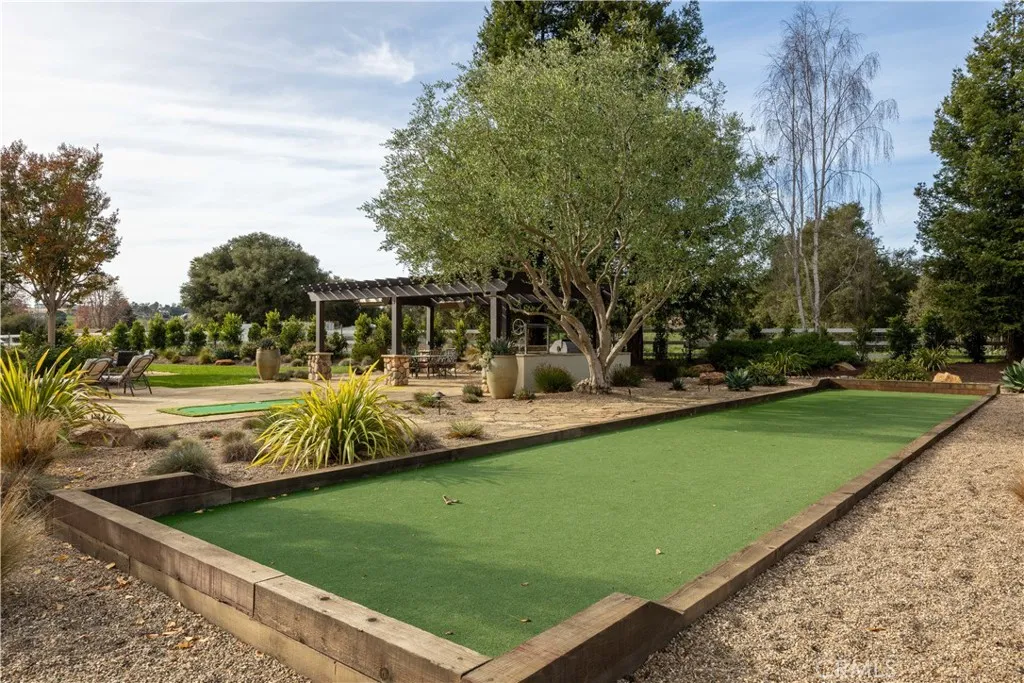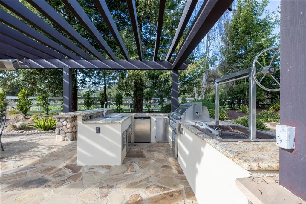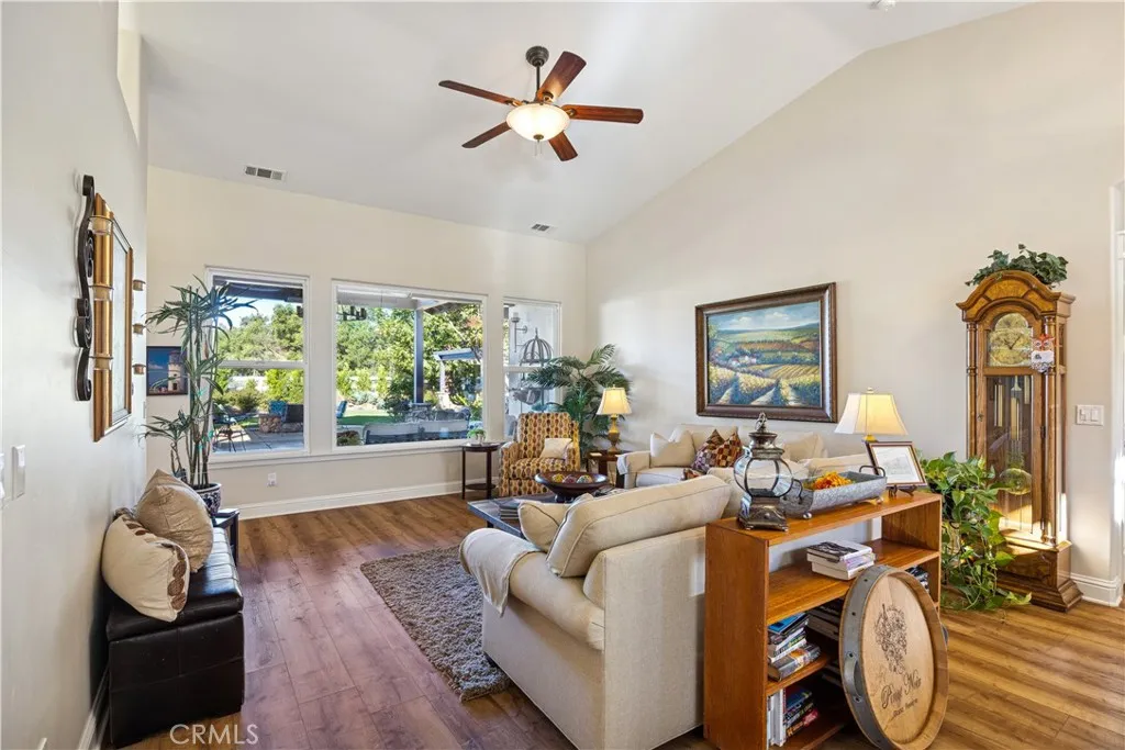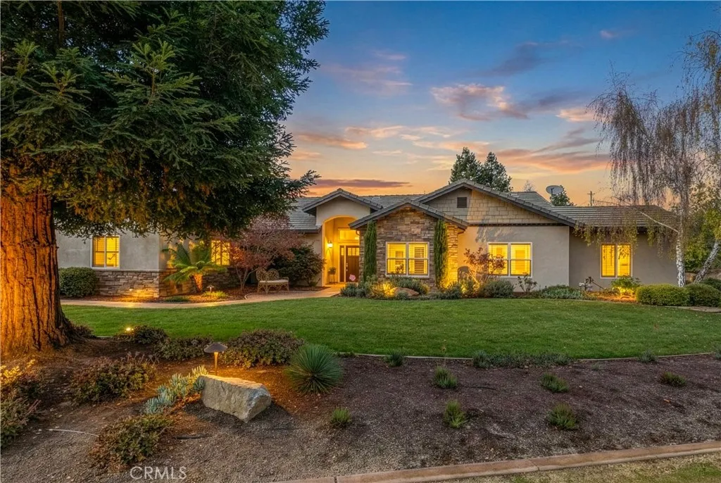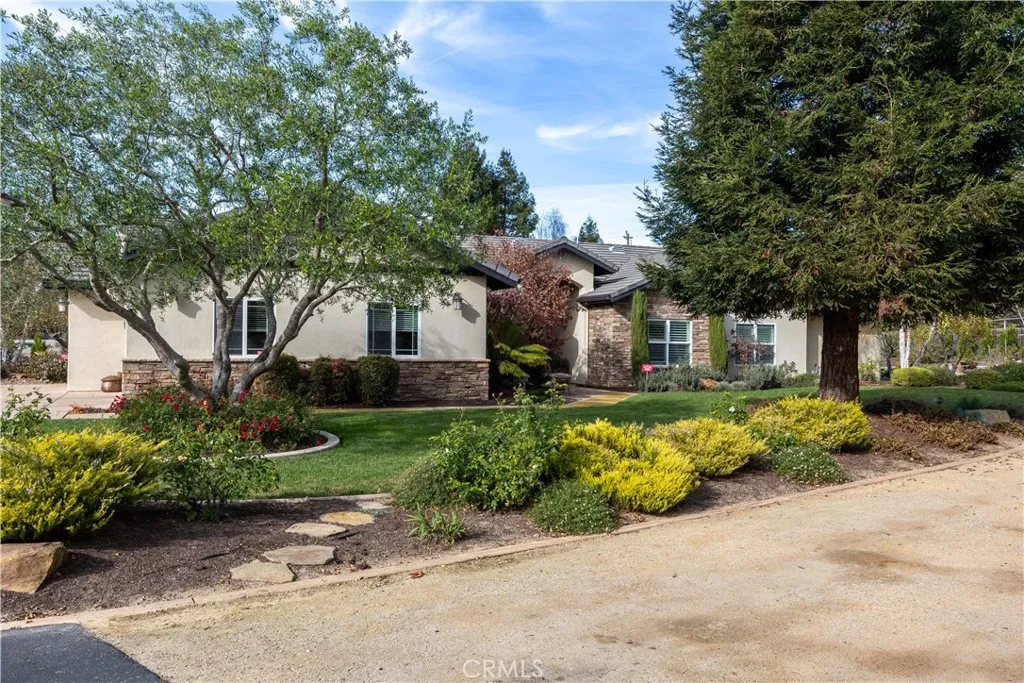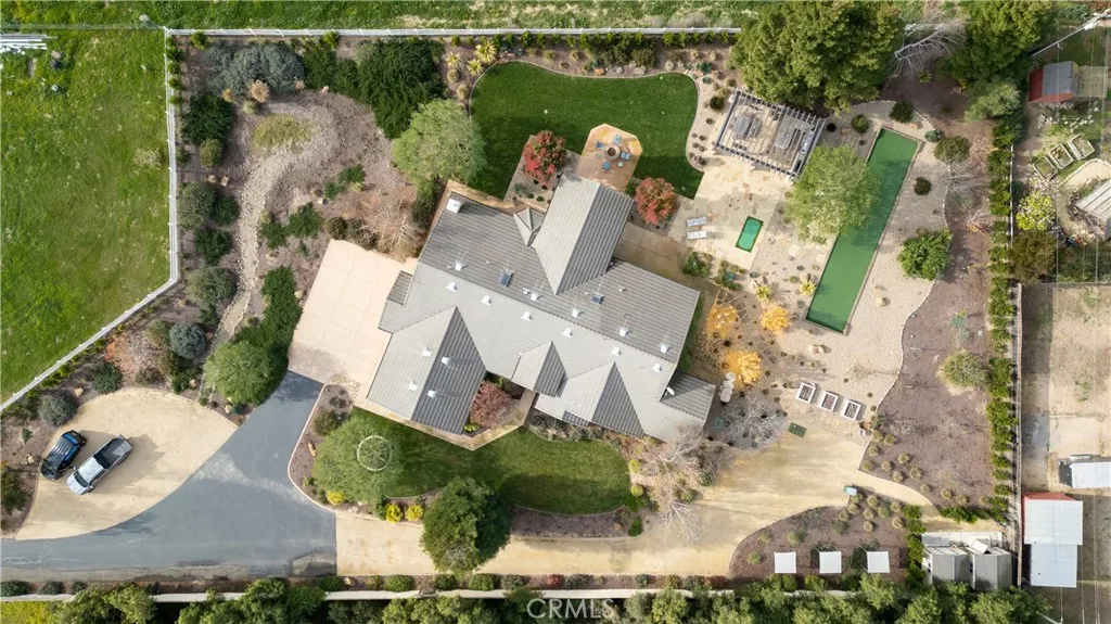 Set on a generous and fully usable 1.01-acre lot, this meticulously maintained 3-bedroom plus den (optional 4th bedroom), 2.5-bath home offers 2,657 square feet of comfortable living paired with exceptional indoor-outdoor amenities. Luxury vinyl plank flooring flows throughout most of the living spaces, beginning in the formal living room where views extend to the covered patio and lush backyard beyond. The dining room flows effortlessly into the well-appointed kitchen with breakfast bar, overlooking the family room and its cozy fireplace. From the breakfast nook, direct access to the covered patio creates a seamless transition for indoor-outdoor living, casual dining, and entertaining. The expansive covered patio is designed for year-round enjoyment, featuring five electric heaters, while the outdoor kitchen is fully equipped with a built-in BBQ, Santa Maria–style grill, refrigerator, two-burner cooktop, and gas heaters to provide warmth while dining al fresco. The home is pre-wired for outdoor surround sound and central vacuum, offering future-ready convenience. Just off the kitchen is the laundry area and a conveniently located powder room. The spacious primary suite serves as a private retreat, featuring a luxurious bath with jetted tub, separate shower enclosure, and direct access to the expansive backyard. Two additional bedrooms share a full hall bath, while the den—ideal as a home office or optional fourth bedroom—also offers access to the back patio. The beautifully landscaped grounds are thoughtfully curated for both relaxation and recreation, featuring winding walkways and paths, raised garden planters, a versatile multi-use court ideal for bocce ball, golf games, and additional leisure activities, and a built-in firepit for evening gatherings. Two storage sheds discreetly support the grounds, while an exceptionally large three-car attached garage—extra deep and extra wide—offers built-in, enclosed storage. An exceptional offering where refined interiors and resort-inspired outdoor amenities come together to create a private retreat perfectly suited for entertaining, unwinding, and elevated everyday living.