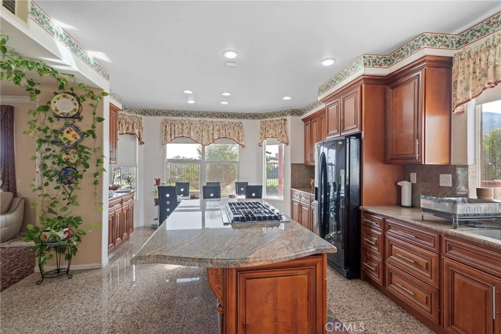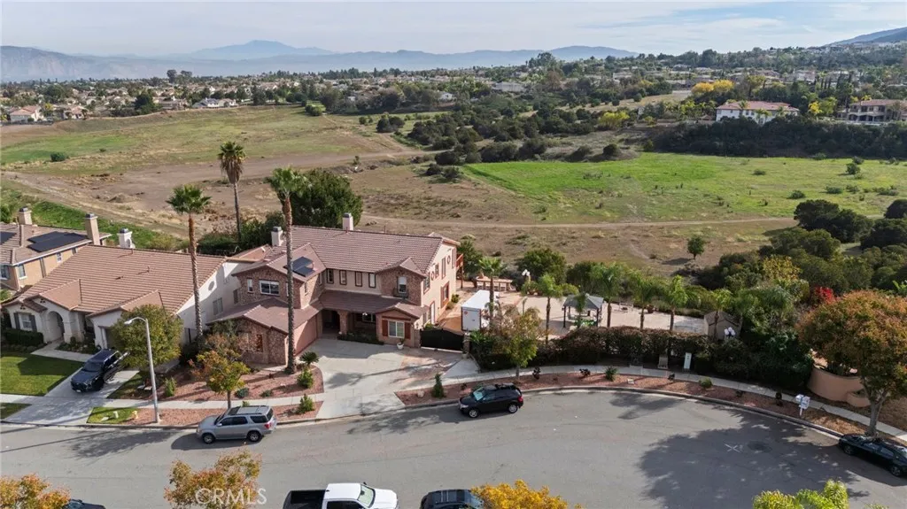 Situated in the scenic green foothills of South Corona, this expansive home offers nearly 4,000 sq. ft. of living space on an over half-acre lot in one of the area’s most desirable neighborhoods. With no rear neighbors, enjoy breathtaking mountain views and exceptional privacy year-round. There are 5 bedrooms upstairs and a full bedroom and bathroom on the main level provide excellent flexibility for guests or multigenerational living. The grand entry welcomes you with a dramatic foyer and chandelier, leading to a formal living room with fireplace and a formal dining room perfect for entertainment. The open family room connects seamlessly to the kitchen and breakfast nook, featuring a center island with countertop seating and ample storage. A dual staircase enhances both function and flow. Upstairs offers a thoughtfully designed layout, including Jack-and-Jill bedrooms and a spacious primary suite with a private balcony, ideal for enjoying panoramic mountain views. An additional main-level office or flex space with attached bath includes private access to both the front and backyard, making it ideal for a home office, studio, gym, or potential guest space. Outdoor living truly shines with a large, covered patio, BBQ island with sink and stove, and expansive yard space perfect for gatherings or relaxation. The property also includes a large double-door RV gate with ample parking for an RV, boat, or additional vehicles, plus a tool shed for extra storage. Additional highlights include dual A/C units and exceptional lot size, offering both comfort and functionality in a prime South Corona location. Close to schools, park and other amenities. Low HOA and taxes.