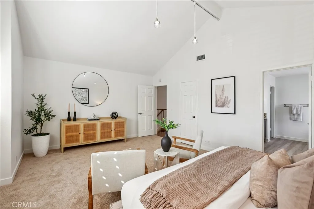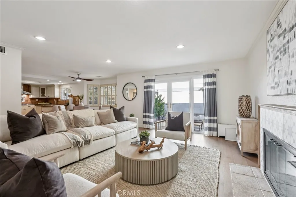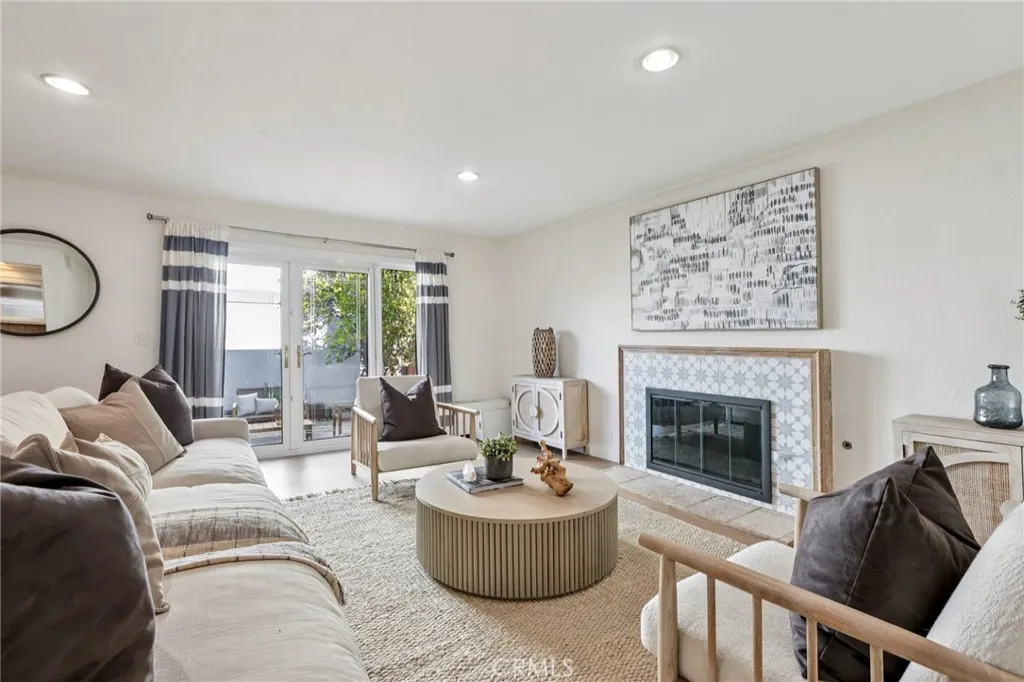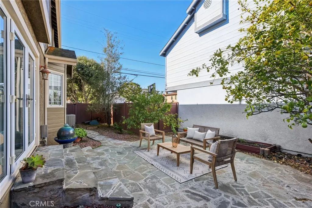 The living room is anchored by a beautifully tiled fireplace—your go-to spot for streaming favorites, cozy nights in, and lingering a little longer once the fire’s lit. French doors open to a private backyard retreat featuring a stone patio, gardening bed, and lemon, lime, and orange trees, creating a peaceful, citrus-kissed escape that’s hard not to linger in.