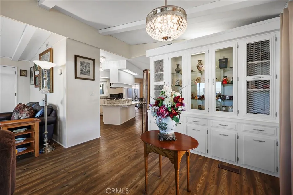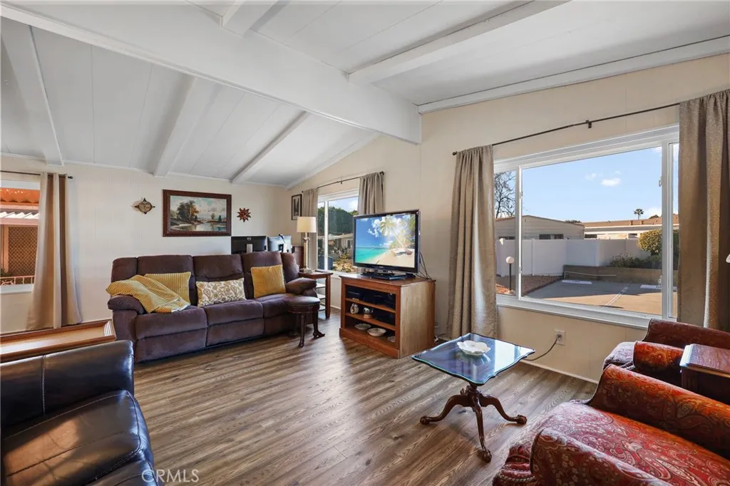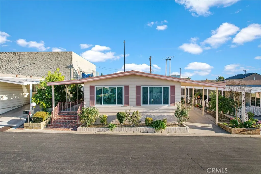Whittier Downs is a welcoming 55+ gated community designed for residents who value connection, creativity, and the comfort that comes from a close-knit neighborhood of just 75 homes. This lovely 2-bedroom, 2-bath home offers a unique and comfortable floorplan—and not a yard of carpet in sight. Built on a solid foundation, the home feels sturdy and traditional, featuring a spacious living room with a 9-foot beamed ceiling, creamy white paneled walls, and two sparkling “Fandeliers” that add personality to both the living and dining areas.