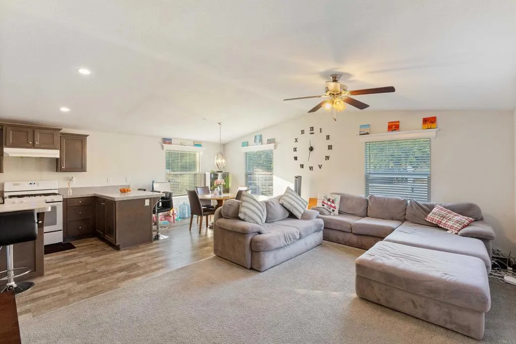 NEWLY BUILT in 2020 on an expansive 11,761 square feet lot! This Manufactured home on land features 3 Bedrooms and 2 Baths, with an open concept layout and high ceilings, beautiful grey washed kitchen cabinets, large center island with a peninsula that borders the dining room. The master suite has a HUGE walk in closet, plenty of storage for linens with 2 other bedrooms and the 2nd bathroom. The Laundry room has outdoor access and shelving for storage. The property is fully FENCED with white vinyl front gate, concrete walkway and a 2 car detached garage with PLENTY SPACE for RV if needed. This home is ideally located close to the I-15 freeway and close to shopping for convenience. DONT MISS OUT ON THIS ONE…NEW ROOF, NEW A/C ..