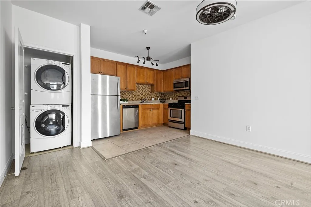 Some photos have been virtually staged. Freshly painted 2 bed/2 bath top floor condo in North Hollywood, moments from NoHo West. Open concept unit in the middle of the building, away from the noise of being on Laurel Canyon. Enjoy the high ceilings, kitchen with granite countertops and stainless steel appliances, including built-in microwave. Stackable washer/dryer in unit. Both bedrooms are spacious with ceiling fan. Primary suite has a walk-in closet and large bathroom with a shower in tub. Second bathroom is also a full bathroom. Rooftop gives full view of the valley. Enjoy a cup of joe while looking at to the mountains.