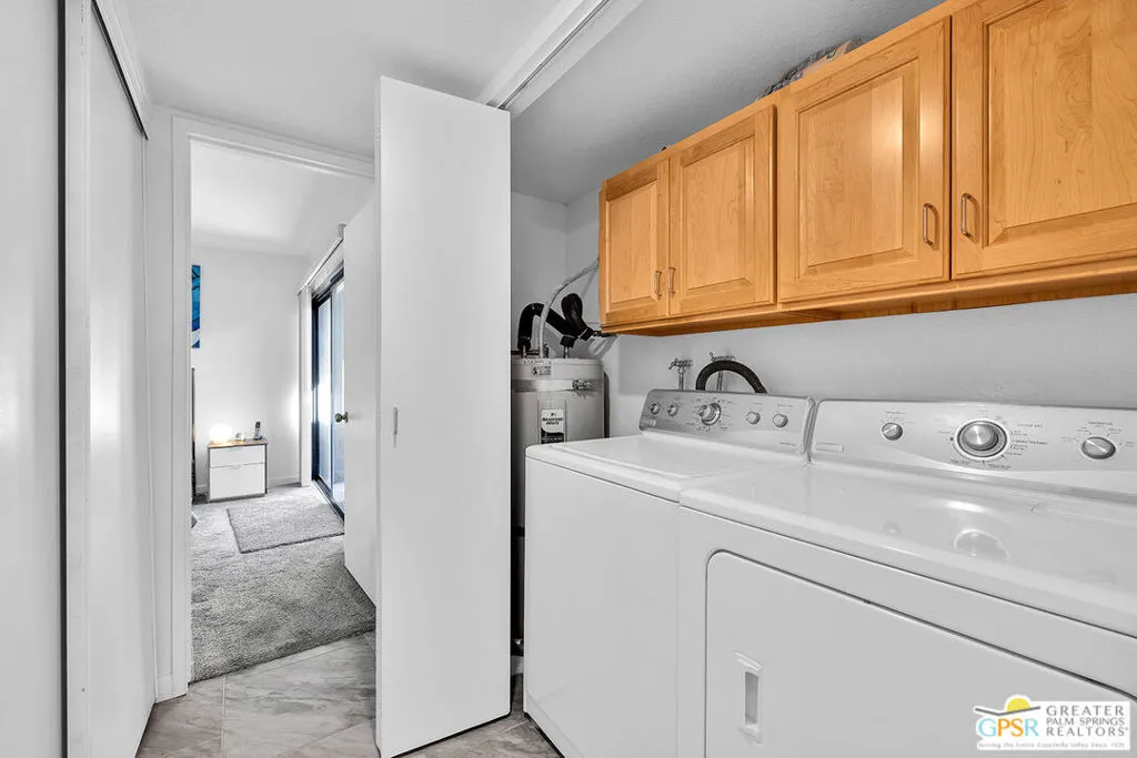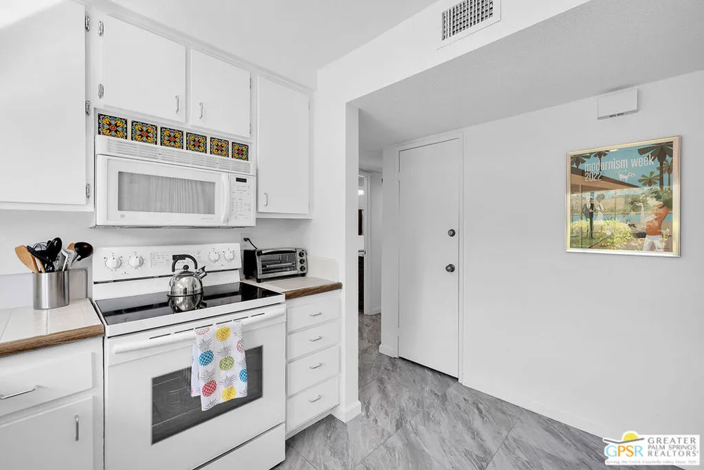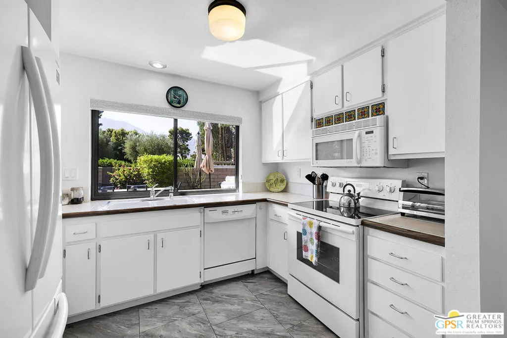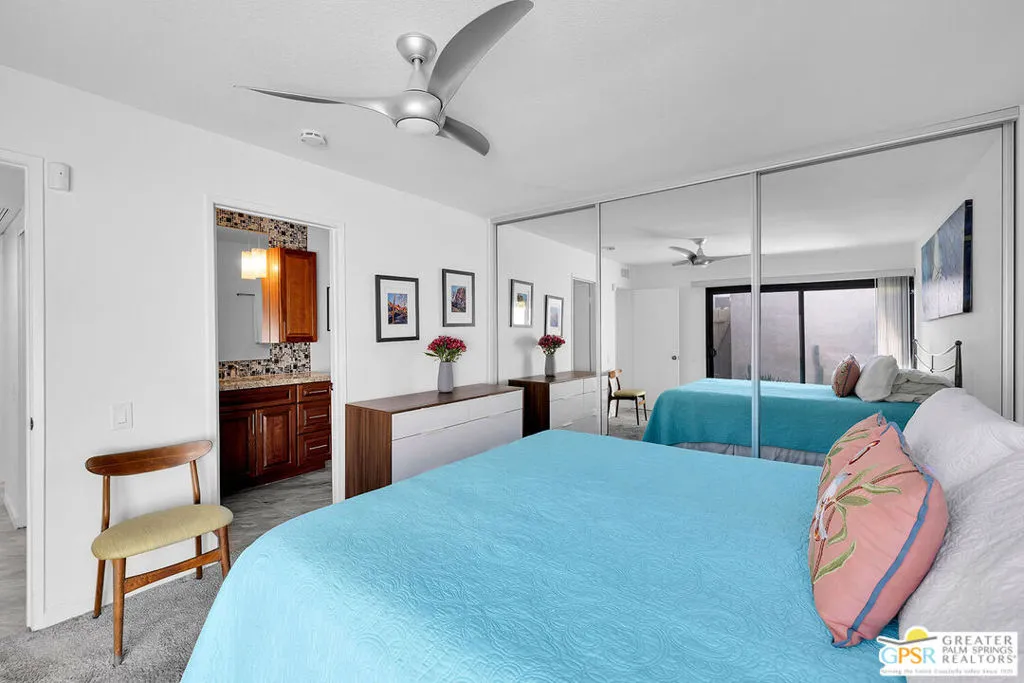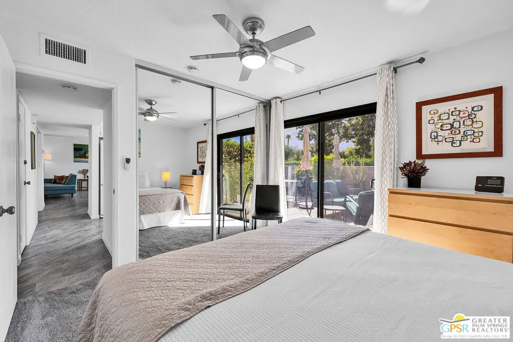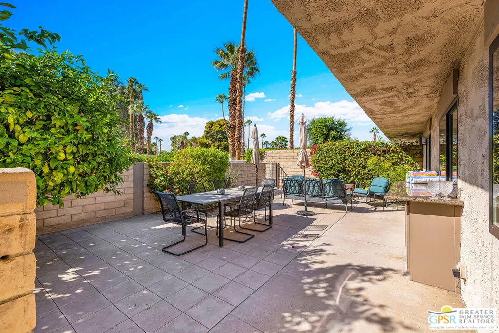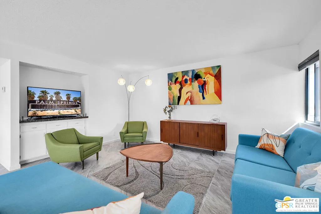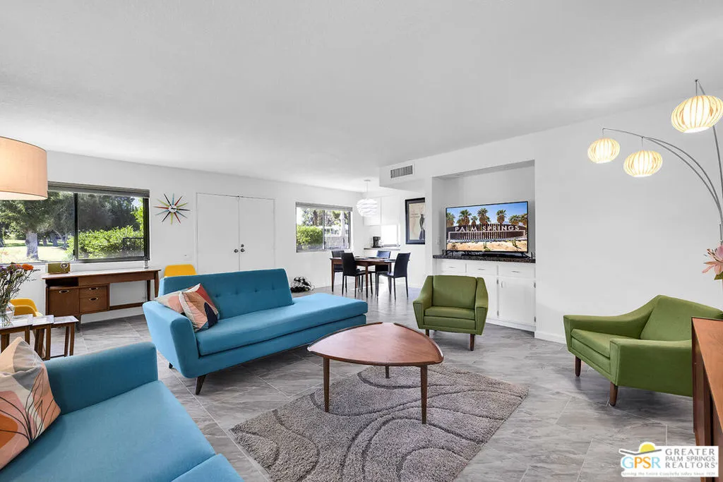 Step into classic Palm Springs style at this Donald Wexler designed mid-century condo in Sagewood, a beautifully spread-out community of just 108 homes across nearly 19 acres. This spacious end unit delivers extra privacy, wide open living space, and jaw-dropping, straight-on west-facing mountain views that never get old. Inside, you’ll find three bedrooms (one currently used as a den), two baths, a large open living room / dining room and a well appointed kitchen for the chef in you. This property is offered turnkey furnished. Outside your door, Sagewood’s lush greenbelts, desert landscaping, and colorful gardens feel more like a private resort than a condo complex. Spend your days floating in one of three pools, playing tennis or pickleball, and hosting sunset cocktails against the dramatic mountain backdrop. HVAC and water heater were replaced in 2023. HOA fees include water, sewer, cable and high-speed internet. Contact agent for private showing. Per seller, Sagewood is very close to achieving Historical Designation, which would allow new owners to apply for the Mills Act tax reduction.